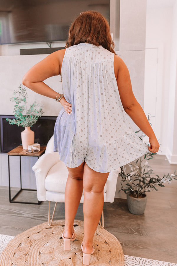 Plus Size - Keep cool all summer long with our adorable light blue 'On A Journey Romper' featuring lightweight flowy material patterned with a small diamond print, a button up bodice with a collared neckline, wide sleeveless shoulder straps, hidden side pockets, and a relaxed shorts silhouette that falls into ruffled upper-thigh length hemlines!
