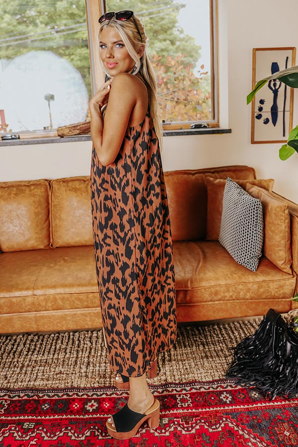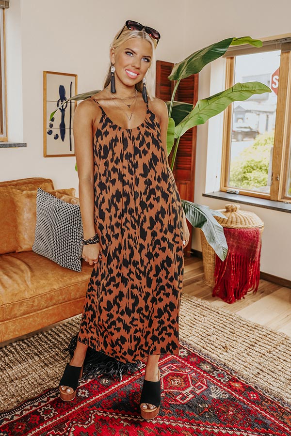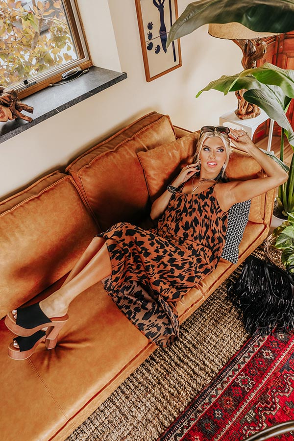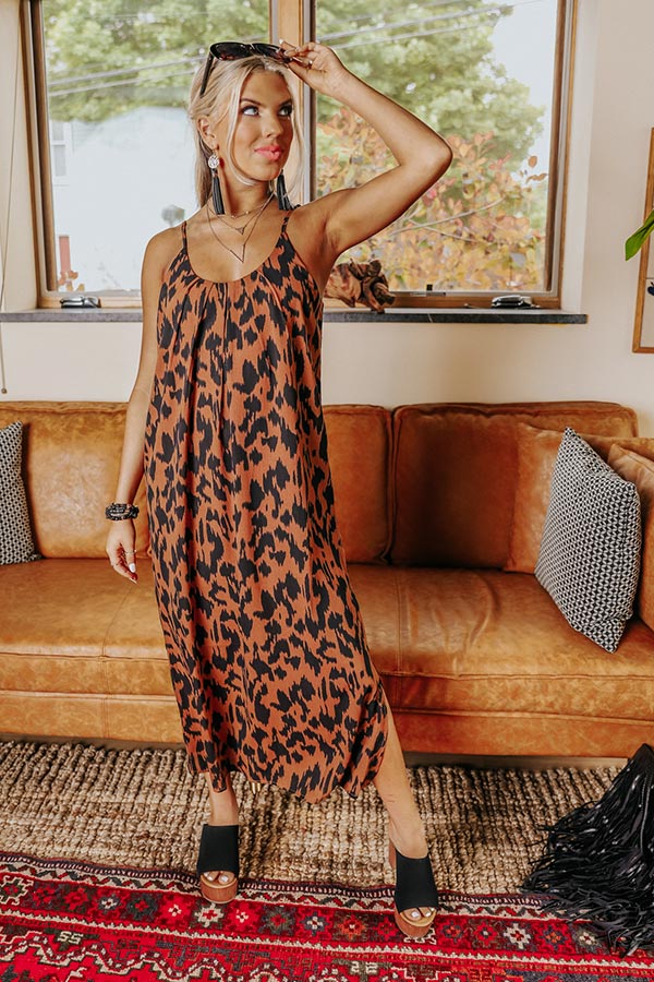 Your look will be on another level when you wear this fierce and flirty brown midi dress featuring lightweight flowy material patterned with a bold black leopard print, a scooped neckline and upper back with adjustable spaghettis traps, and a relaxed silhouette that cascades into a straight mid-calf length hemline! Measurements