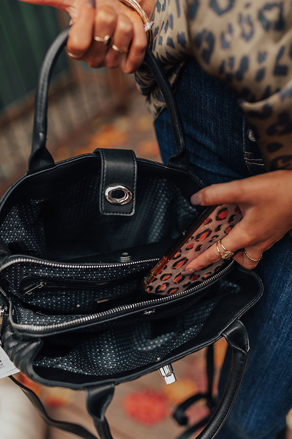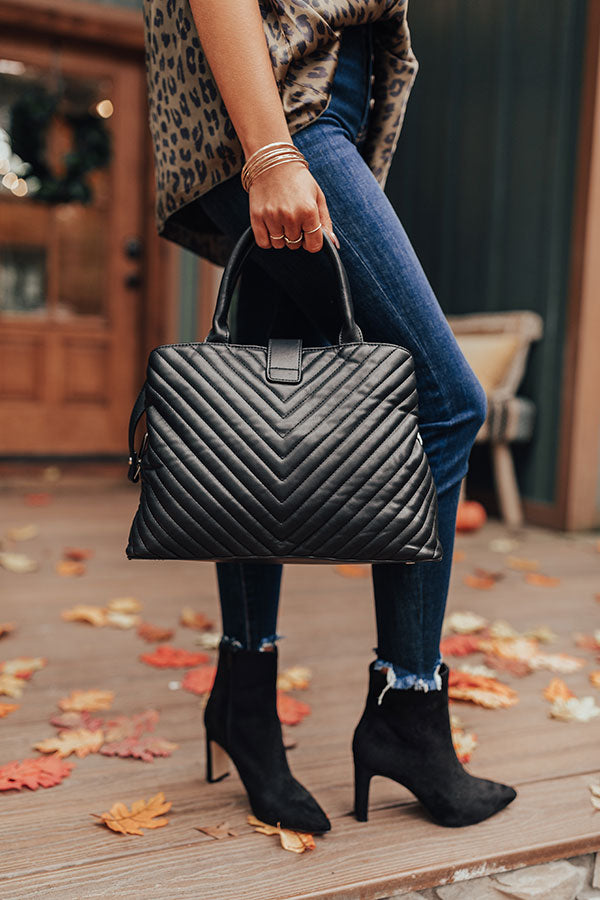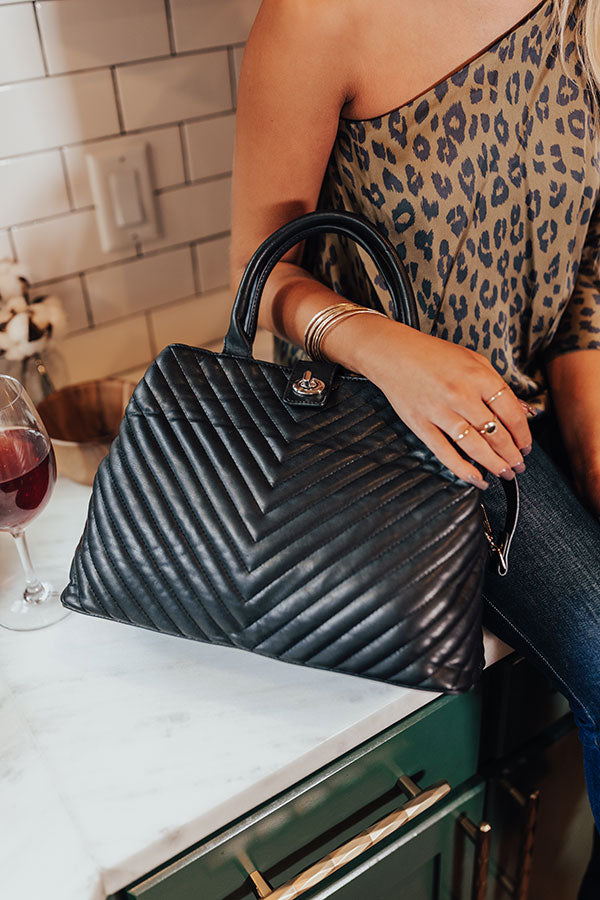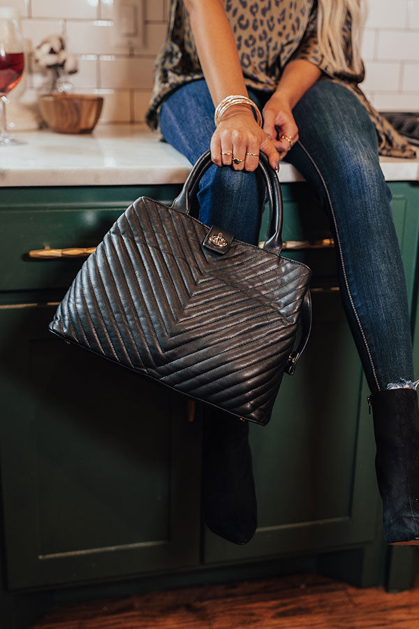 This chic black tote is totally "on brand" with its sleek faux leather material, diagonal ribbed texturing, two rounded tote handles, and spacious lightweight rectangular fully lined silhouette with a twist closure and additional zip closure pockets on the inside!