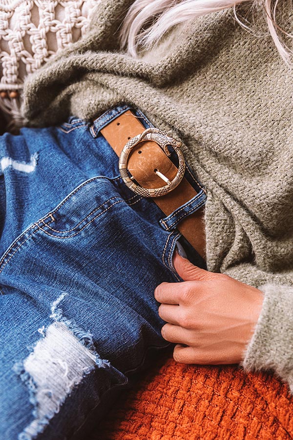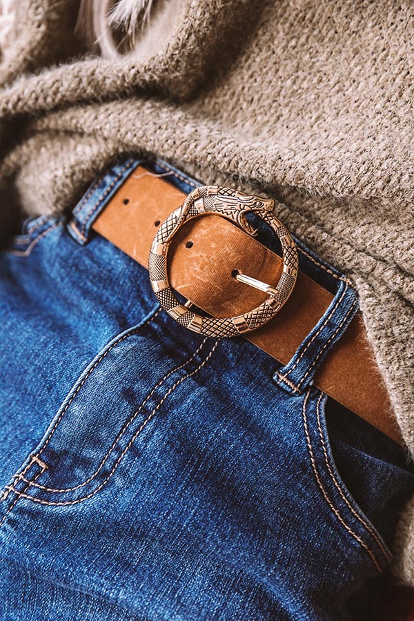 Stay "on brand" by finishing off your look with this adorable statement belt featuring a wide brown strap with an oversized gold circle snake buckle!
