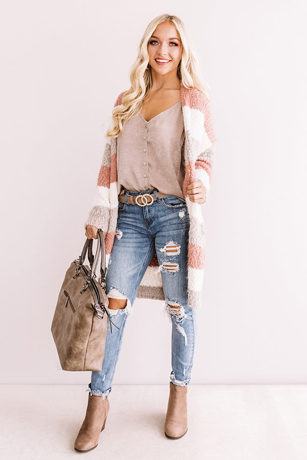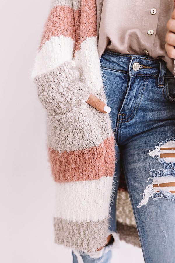You will be "on cloud nine" when you wear this warm cardigan featuring warm loose knit material, a lightweight fit, horizontal color block stripes, long oversized sleeves, hidden accent side pockets, and an open front silhouette that falls into a straight knee length hemline! You can style this versatile piece with just about anything from a basic tank to a sweater, jeans to dresses, wedges to sandals, clutches to totes, and hats to earrings!