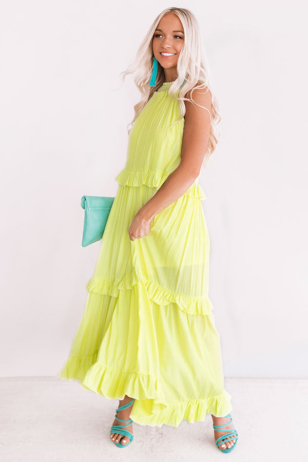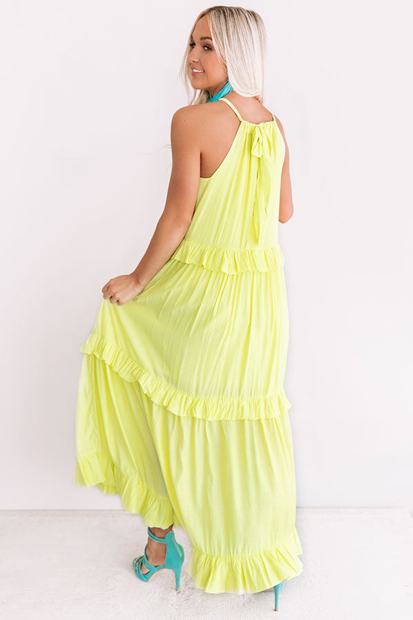This three tiered maxi dress has a high neckline and 1-inch straps that tie together in the back! Plus, the long, airy fabric is broken up by three rows of ruffles at the neck, waist, and knees! The neckline has elastic stitching to ensure the dress is hugging you correctly and the lime punch color looks beautiful styled with oversized earrings and our "Parker Faux Suede Lace Up Heel" for the ideal "on holiday" look! Measurements