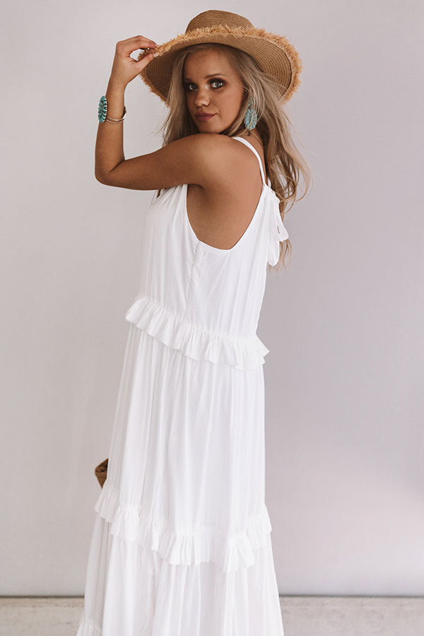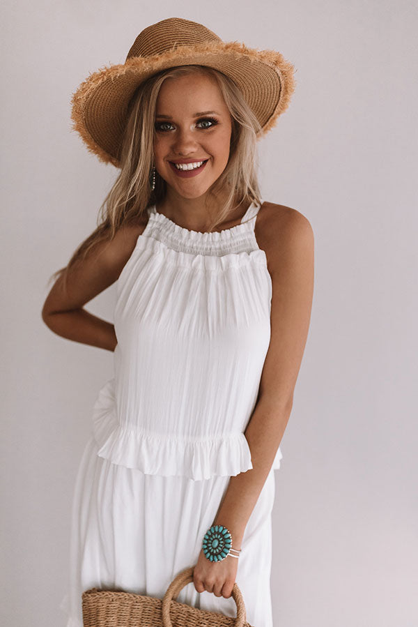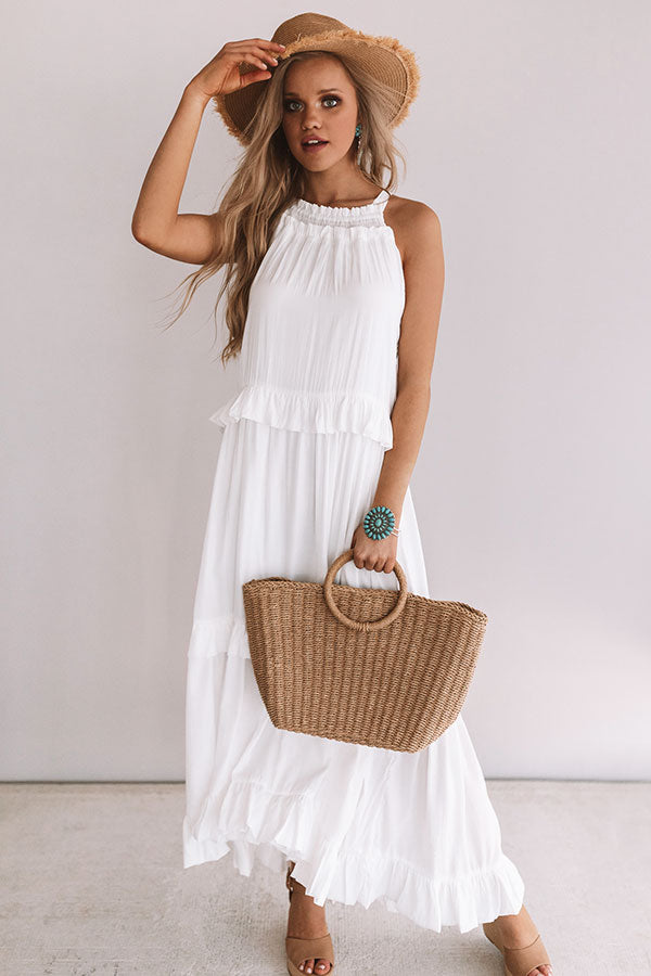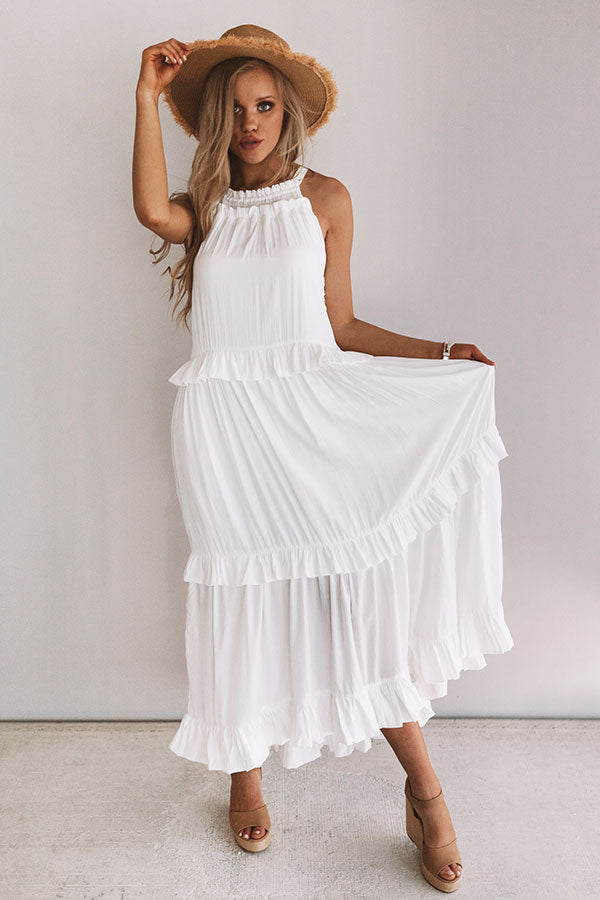 This three tiered maxi dress has a high neckline and 1-inch straps that tie together in the back! Plus, the long, airy fabric is broken up by three rows of ruffles at the neck, waist, and knees! The neckline has elastic stitching to ensure the dress is fitted in all the right places! The white color will make you look like a modern icon when styled with nude heels and a straw tote and hat while on summer holiday! The inside sip allows you to wear this piece by itself while still having full coverage. Measurements
