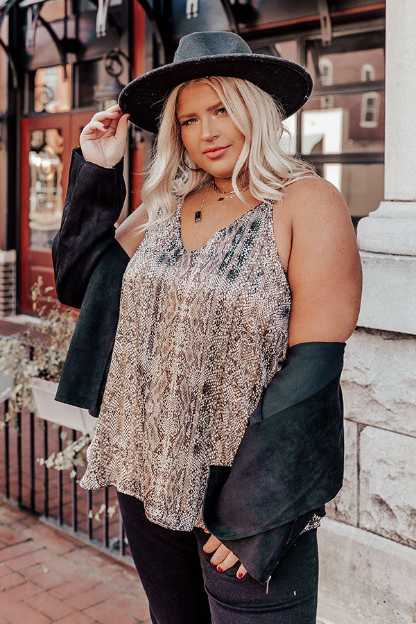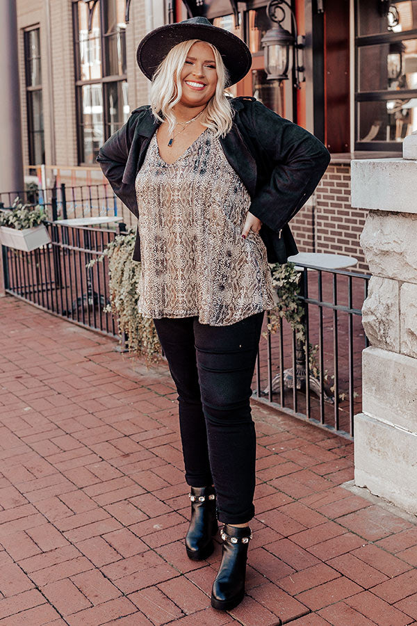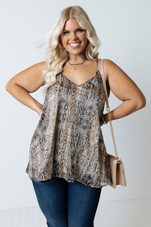 You will surely want to take a pic in this blog-worthy plus size tank featuring lightweight material patterned with a black and natural hued snake print, a v-cut neckline, spaghetti straps with a racerback fit, and a relaxed silhouette that falls into a straight hemline!