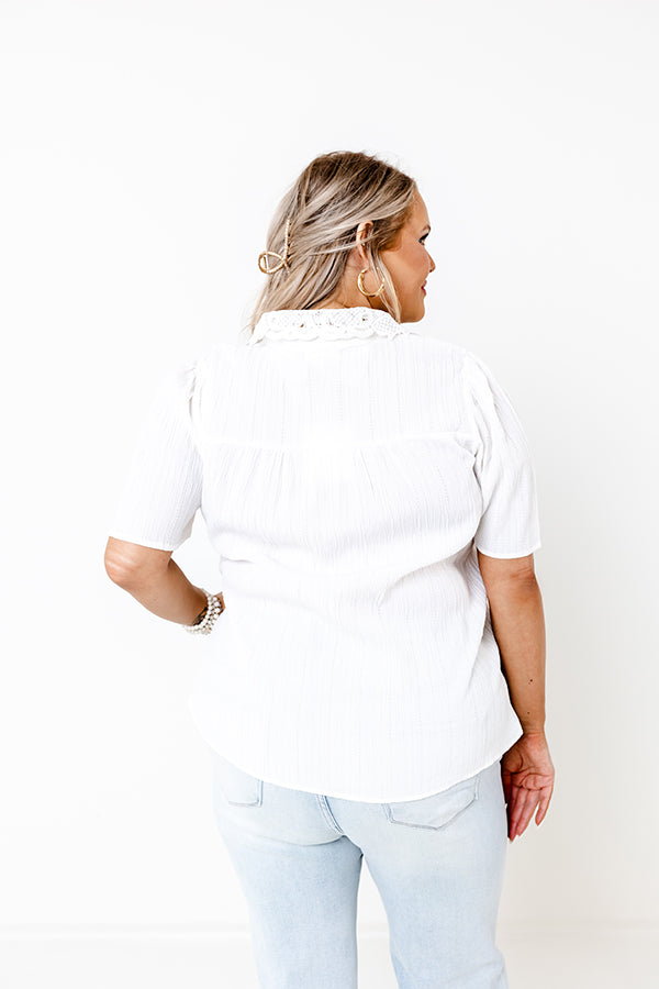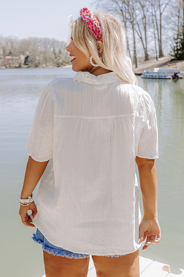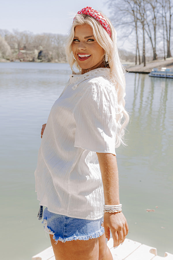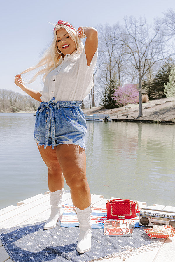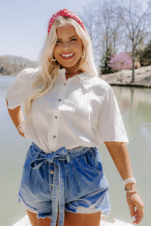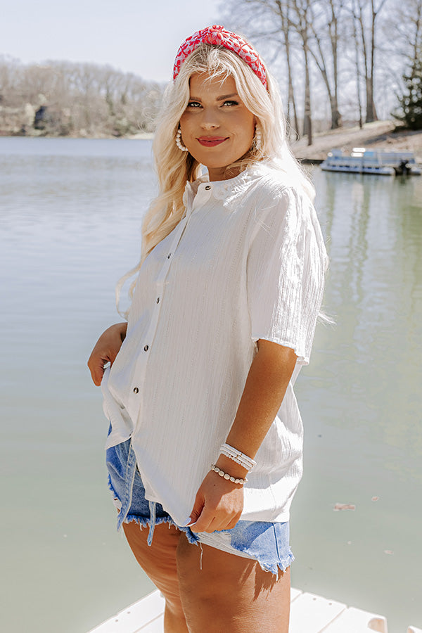 There is no better piece to wear while on the boat all summer long than this classy white plus size top featuring lightweight material with subtle vertical accent stripes, a button up front with a collared neckline, short sleeves, and a relaxed silhouette that falls into a rounded hemline! on products