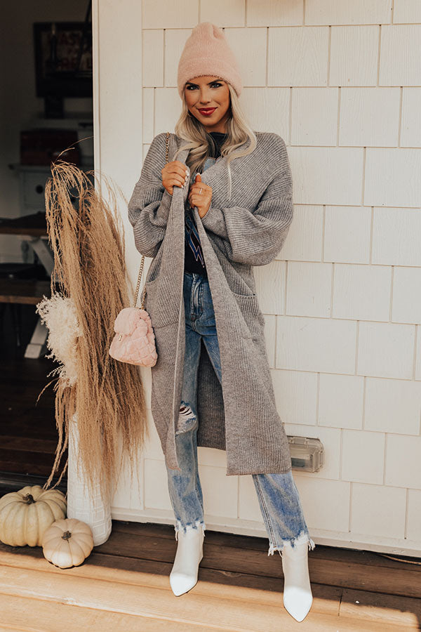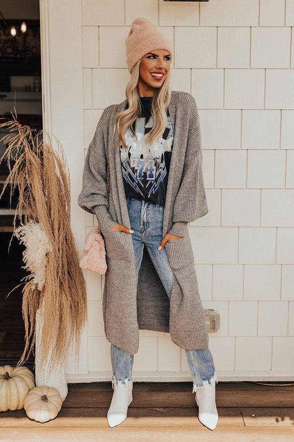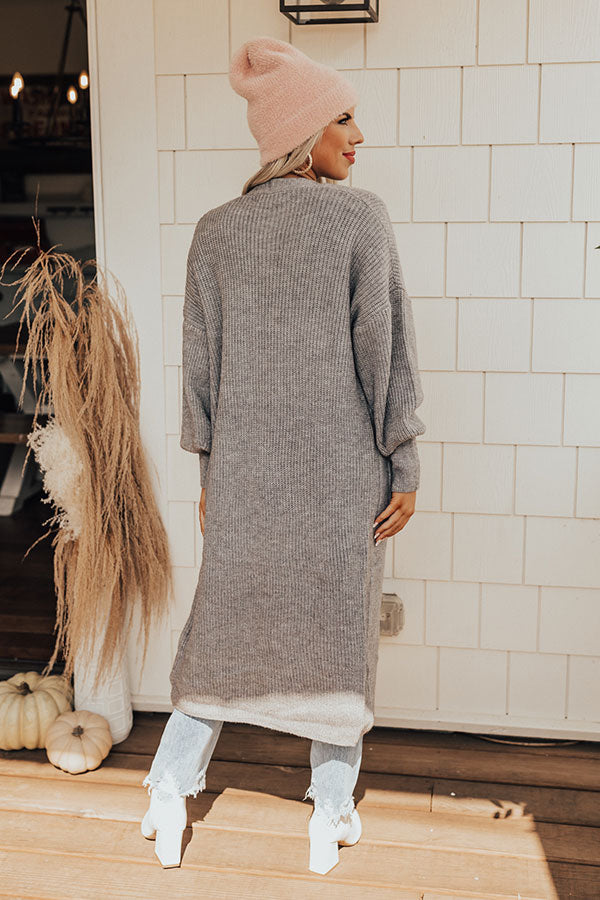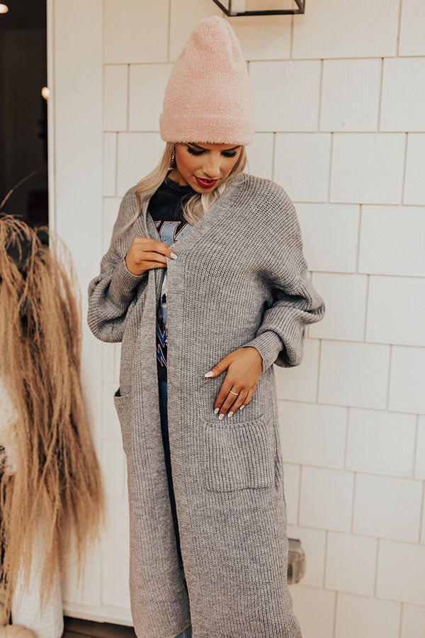 Wrap yourself in warmth with our versatile grey 'On The Clock' cardigan featuring thick and warm knit material, long loose sleeves, low hidden pockets, and a draped open front silhouette that cascades into a straight mid-calf length hemline!