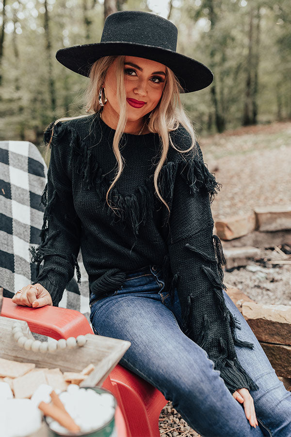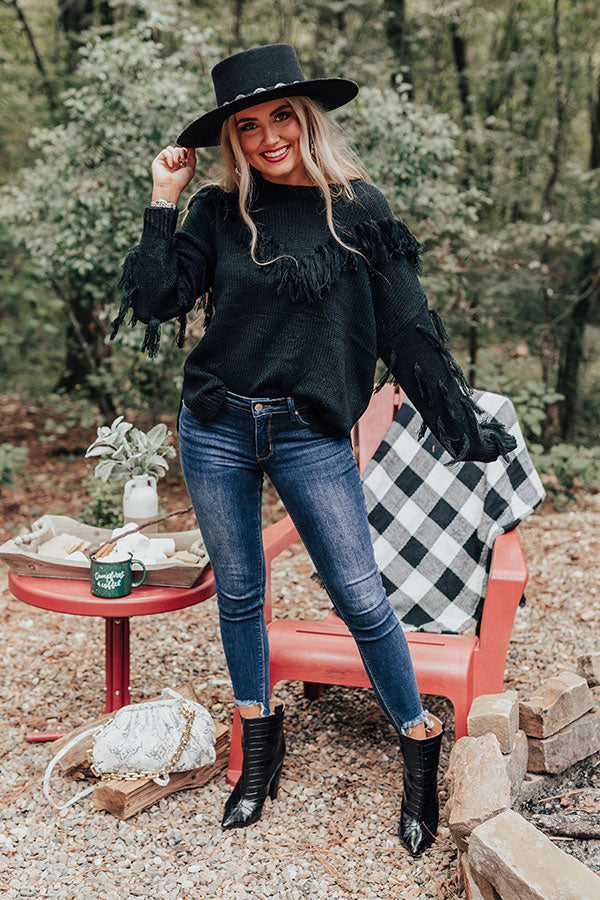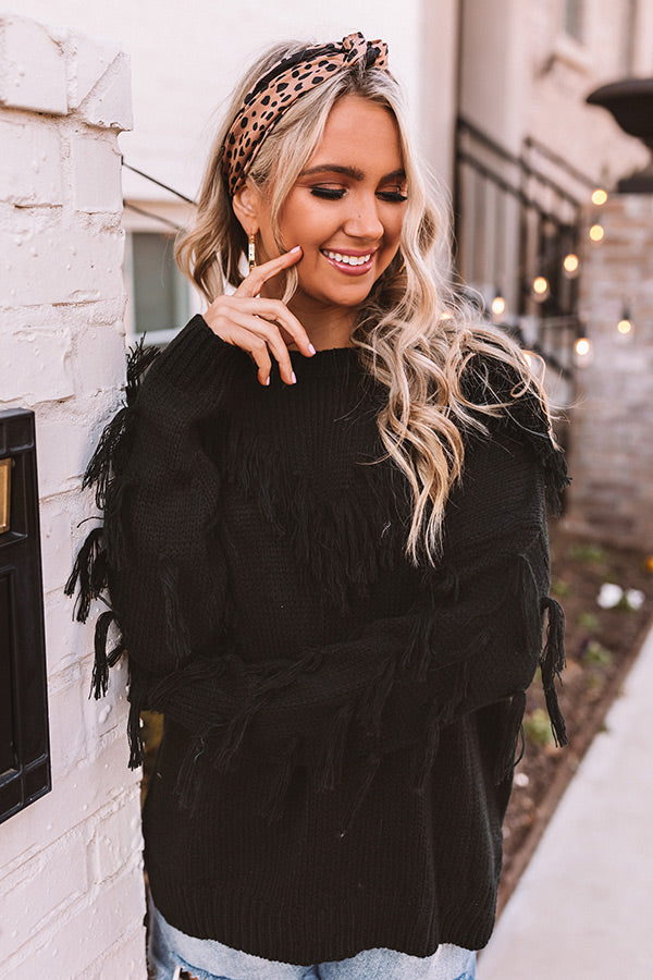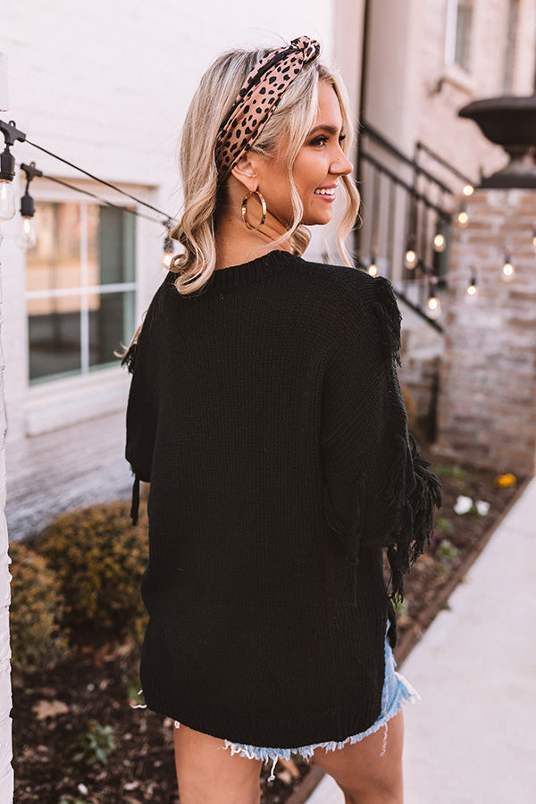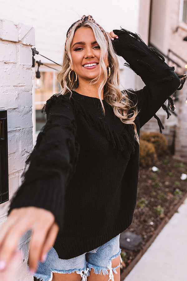 You are sure to turn heads in our eye-catching black "On The Fringe" sweater featuring soft and thick tight knit material with oversized fringe detailing, long loose sleeves, a high rounded neckline, ribbed texturing on the trim, and a relaxed silhouette that falls into a straight hemline with accent side slits! Measurements