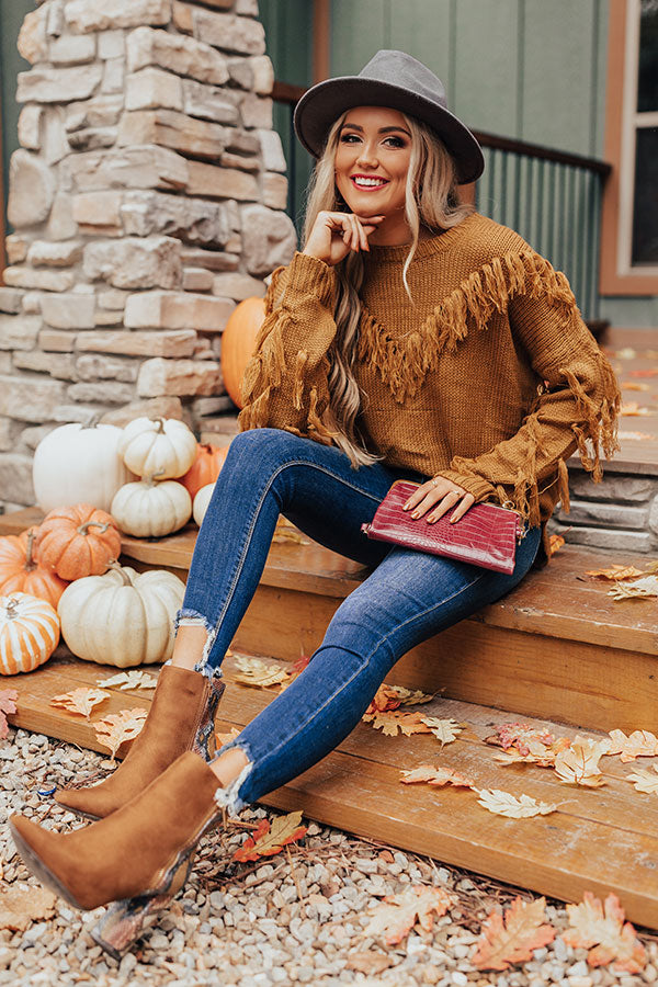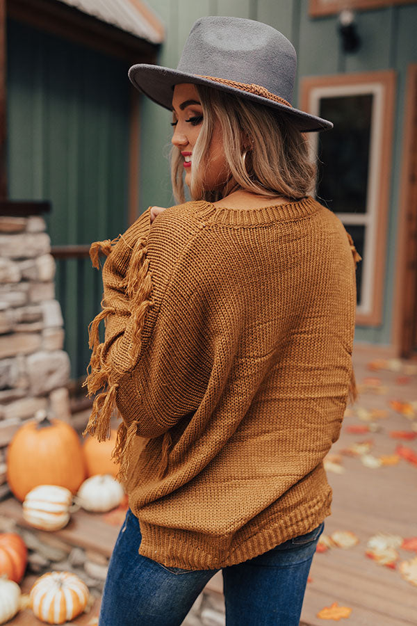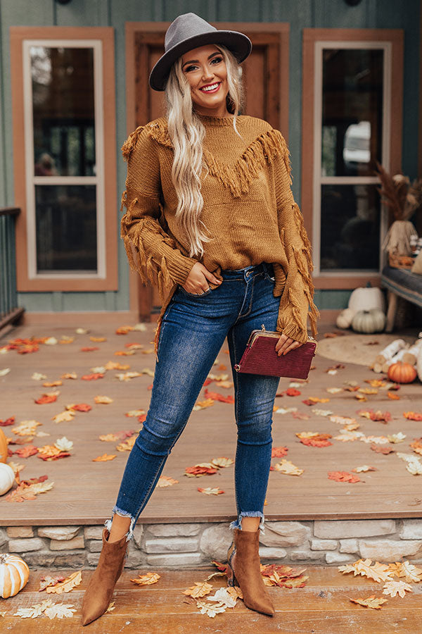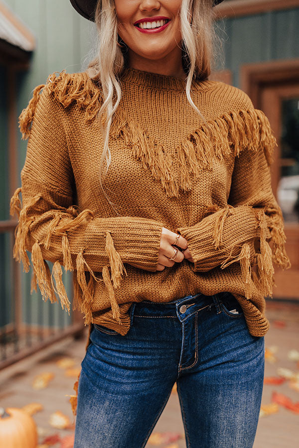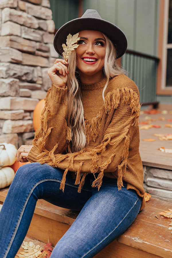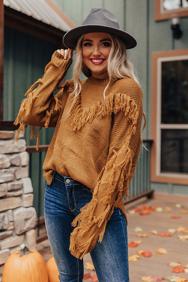 You are sure to turn heads in our eye-catching mustard colored "On The Fringe" sweater featuring soft and thick tight knit material with oversized fringe detailing, long loose sleeves, a high rounded neckline, ribbed texturing on the trim, and a relaxed silhouette that falls into a straight hemline with accent side slits! Measurements