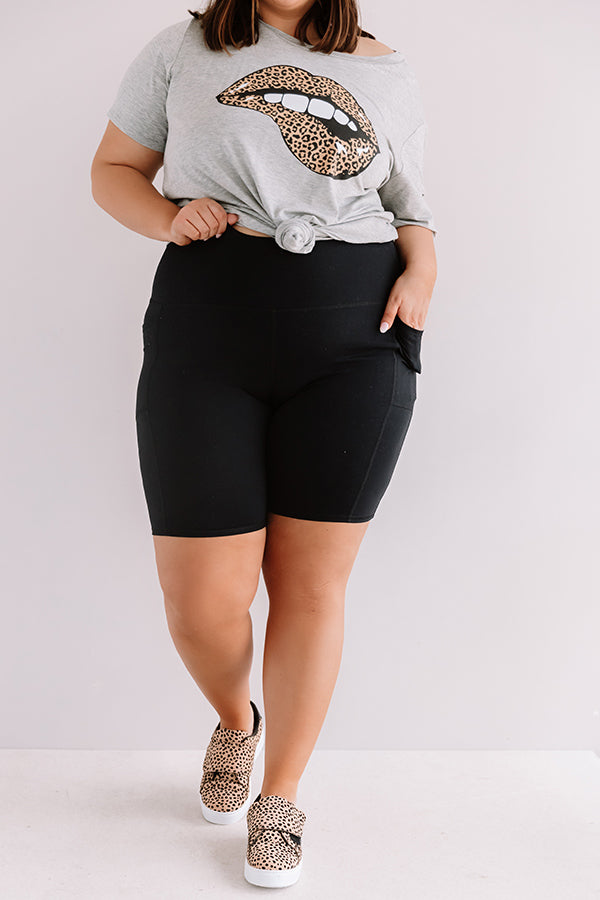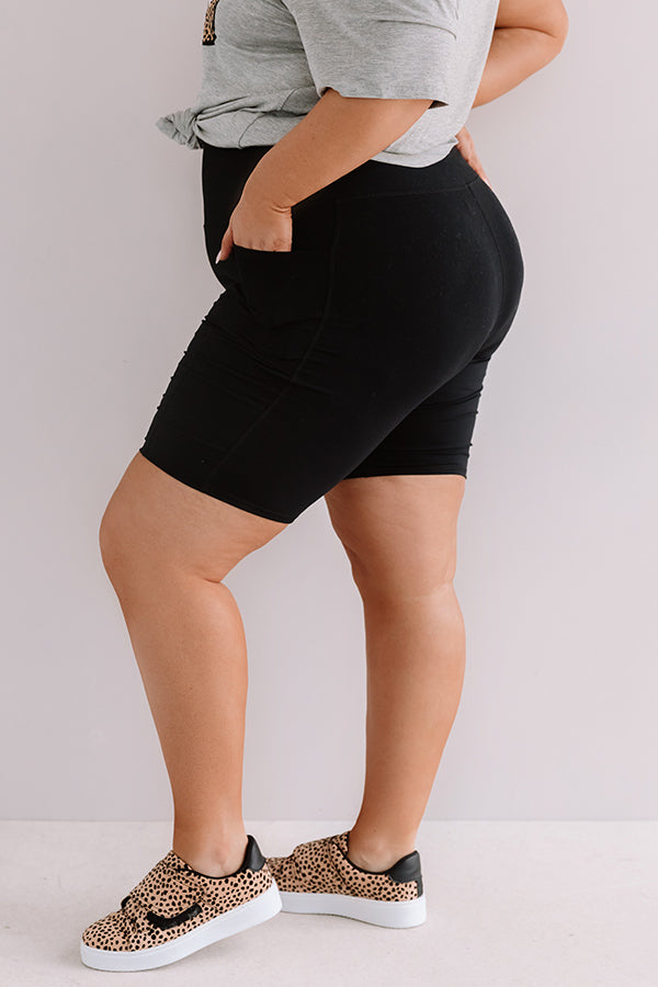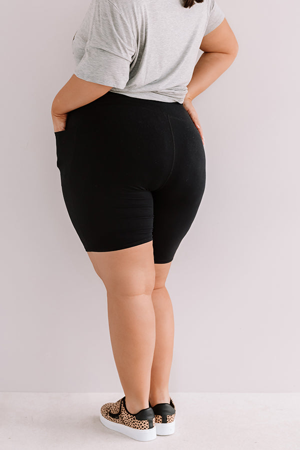 Plus Size - Run around town in style with our adorable black "On The Right Track" active shorts featuring lightweight four way stretch material, a wide high waistline for tummy control, accent side pockets, and a form fitting silhouette that falls into straight lower-thigh length hemlines! This adorable athleisure piece pairs perfectly with a variety of sports bras or tops and trendy sneakers for the ultimate workout set! Measurements