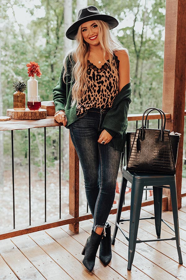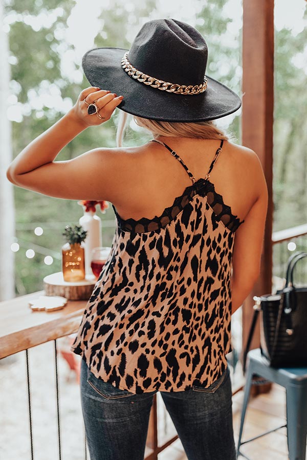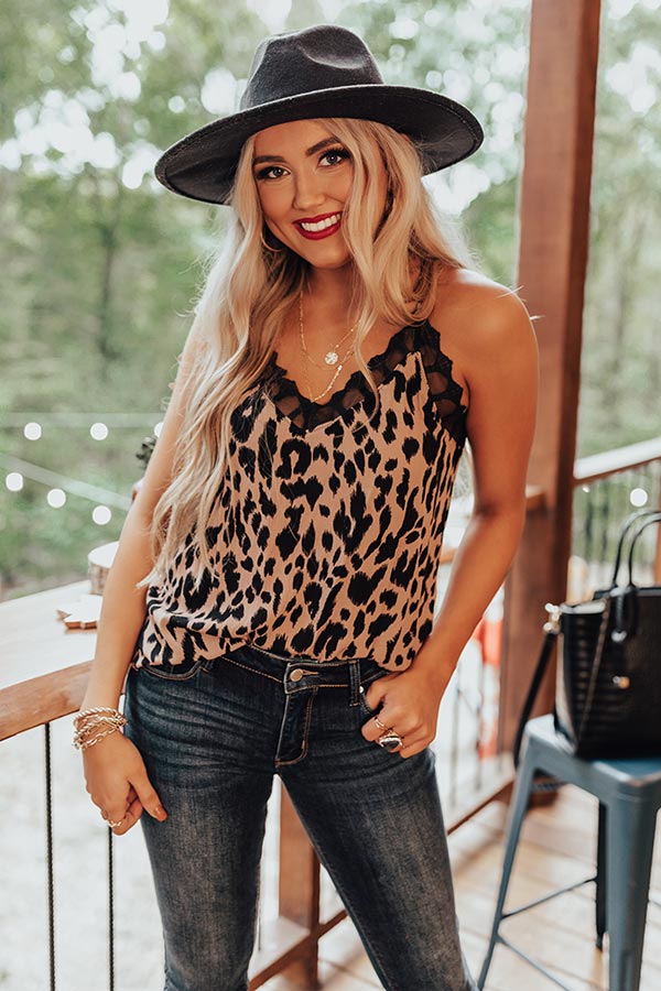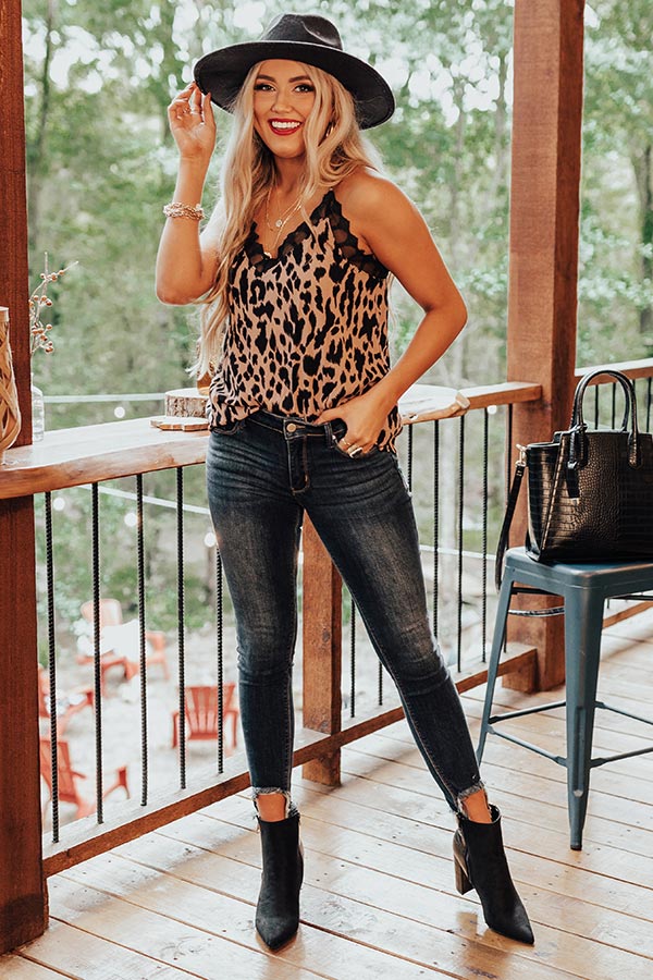 You will look like you are fresh off the runway when you wear this stunning dusty purple colored tank featuring sleek lightweight material patterned with a bold black leopard print, a v-cut neckline, adjustable spaghetti straps with a racerback fit, intricate lace trim detailing, and a relaxed silhouette that falls into a straight hemline! Measurements