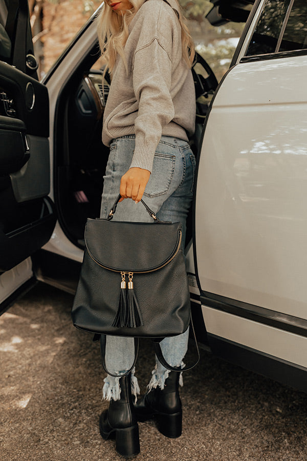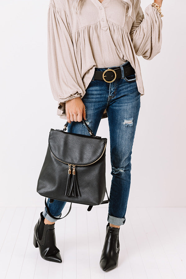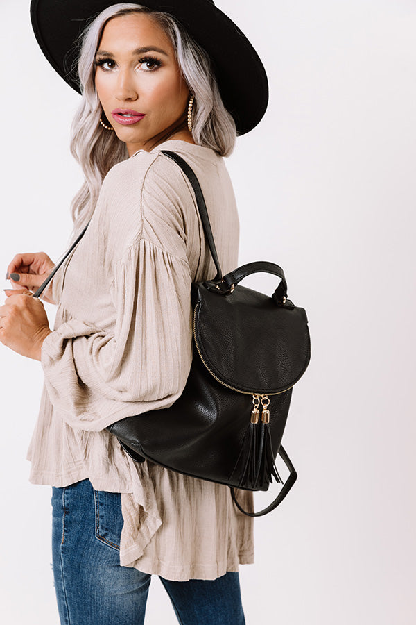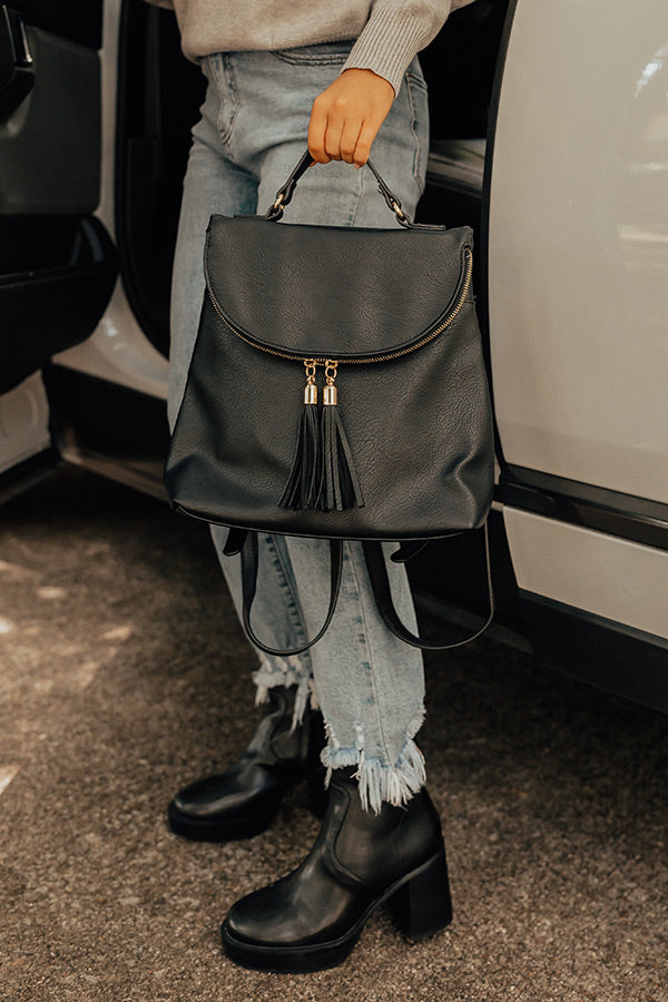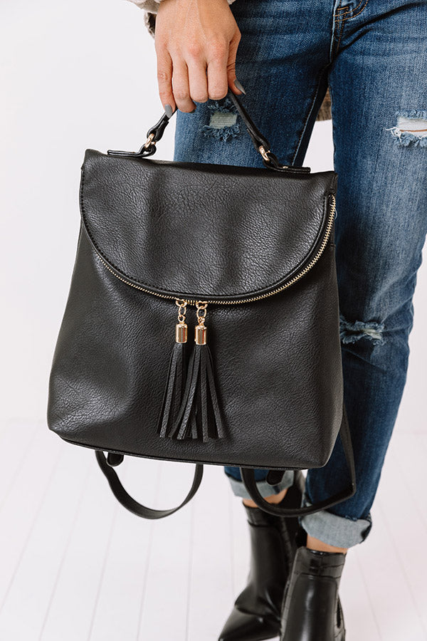 Backpack goals! Our black 'On The Way Faux Leather Backpack' features a double tassel zipper enclosure, upper handle, adjustable straps, and a black cloth inner lining!