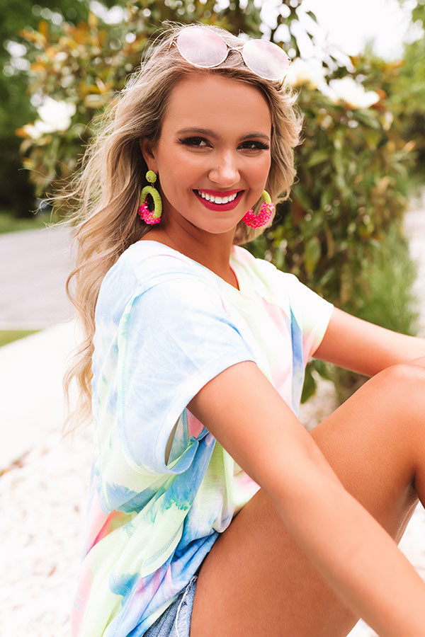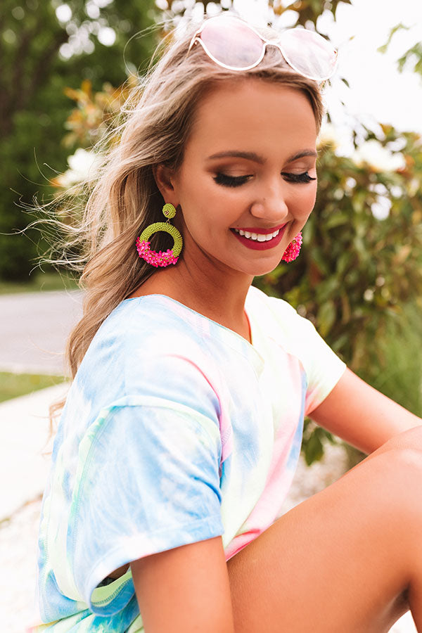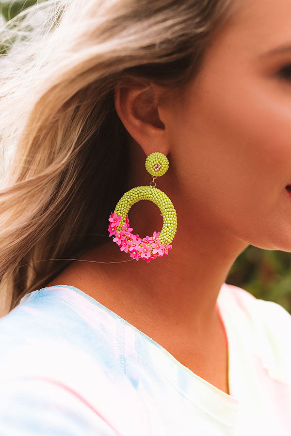 Stand out on vacay with our adorable "On Tiki Time" statement earrings featuring beaded half ball studs and dangling lime punch colored beaded hoops with multi colored sequin flowers accents!