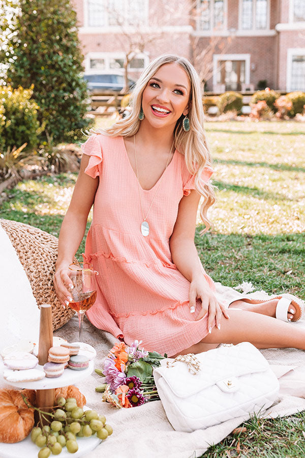 You are sure to be "on tiki time" when you wear this charming peach colored shift dress featuring lightweight breeze material, a v-cut neckline, ruffled cap sleeves, exposed accent seams, and an ultra relaxed silhouette that falls into an uneven mid-thigh length hemline! We have styled this adorable piece with some cheetah print wedges and a blush crossbody and headband, but you can also wear it layered under a cropped denim jacket with our trendy "Ansley Sneaker!" Measurements