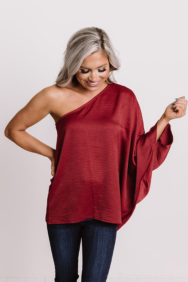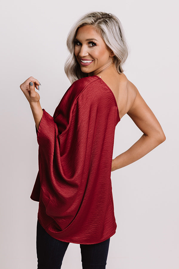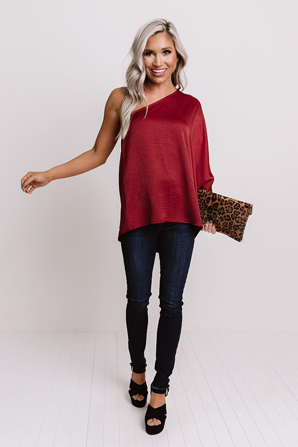 You are sure to make an elegant entrance in our gorgeous crimson colored "On Tour Shift Top" featuring sleek lightweight satin material, a diagonal neckline and an upper back, a single oversized long bat wing sleeve with a fitted elastic band cuff, and an ultra draped silhouette that falls into an uneven hemline! Measurements