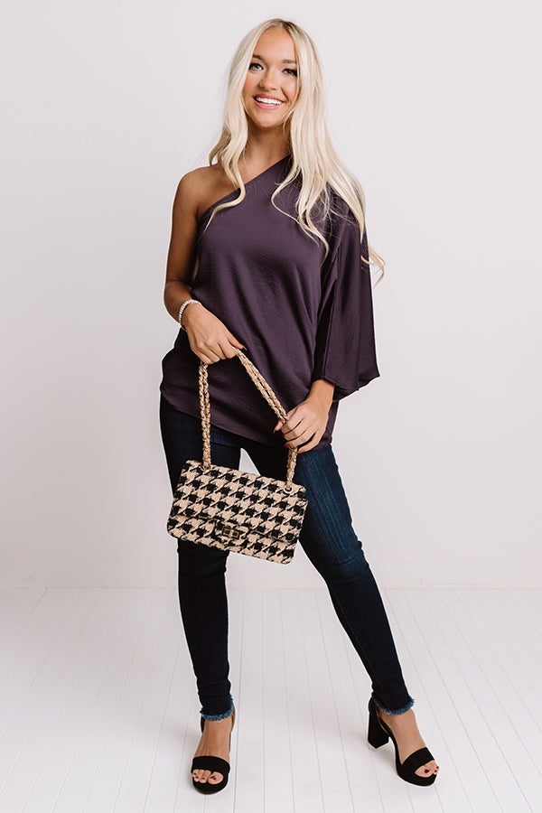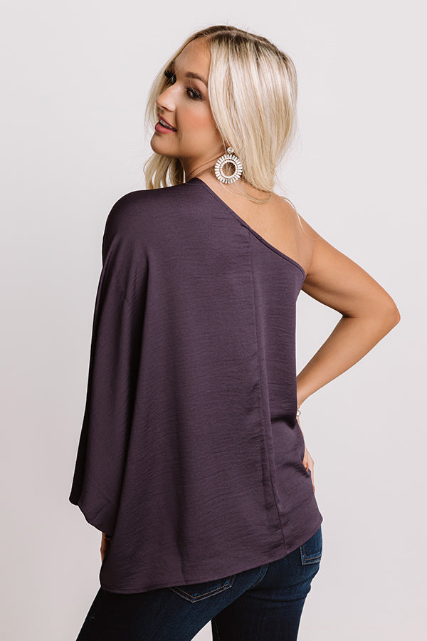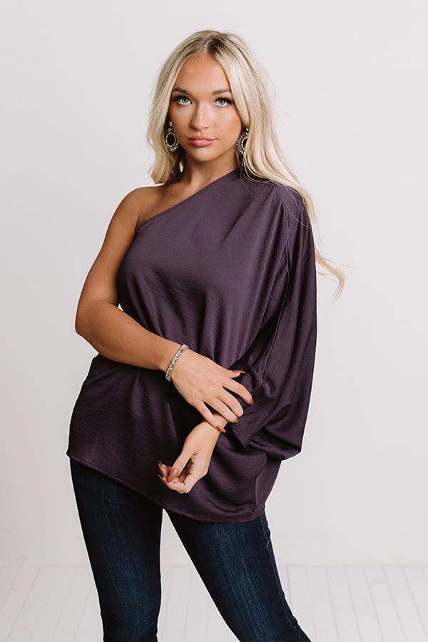 You are sure to make an elegant entrance in our gorgeous royal plum colored "On Tour Shift Top" featuring sleek lightweight satin material, a diagonal neckline and an upper back, a single oversized long bat wing sleeve with a fitted elastic band cuff, and an ultra draped silhouette that falls into an uneven hemline! Measurements