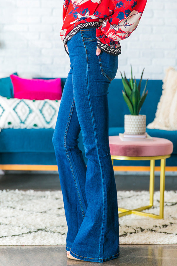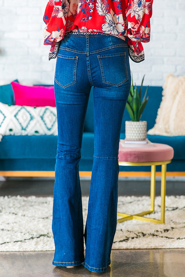 These dark wash denim flares have a concealed elasticized waist, a mid rise fit, a sleek stretchy fitted silhouette & a retro flared hem.