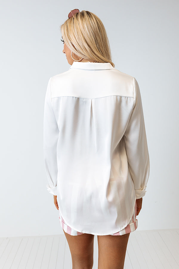 Make a vibrant statement in our cute white 'Once In A Lifetime' top featuring lightweight and flowy satin material, a button down front with a collared neckline, long loose sleeves with button closure cuffs, a single faux accent chest pocket cut, and a relaxed silhouette that falls into a rounded hemline!