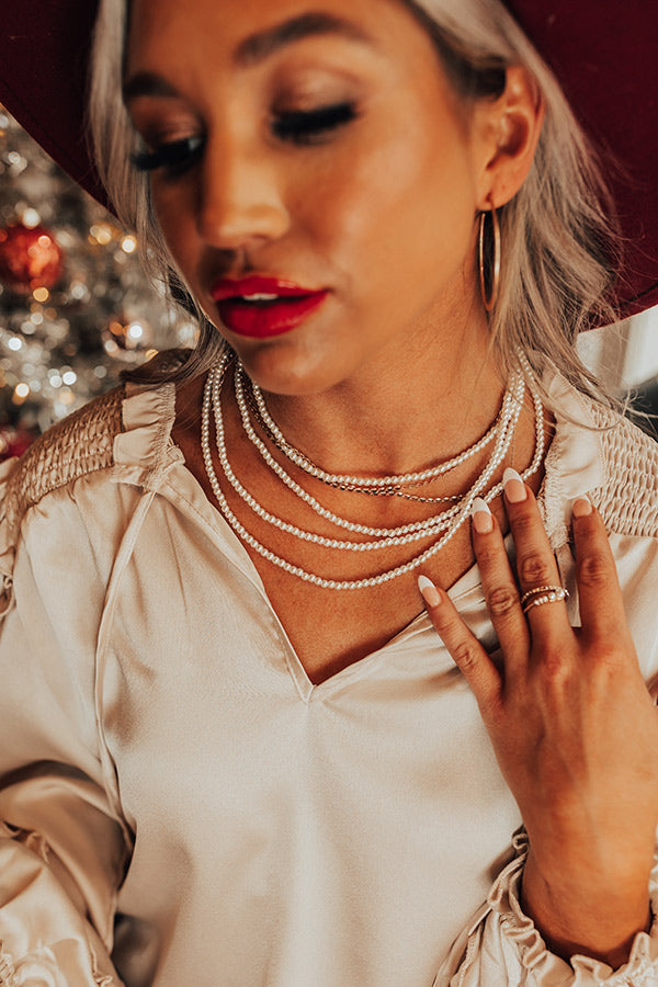 - Luxurious layers of gold chains and strands of ivory colored pearls