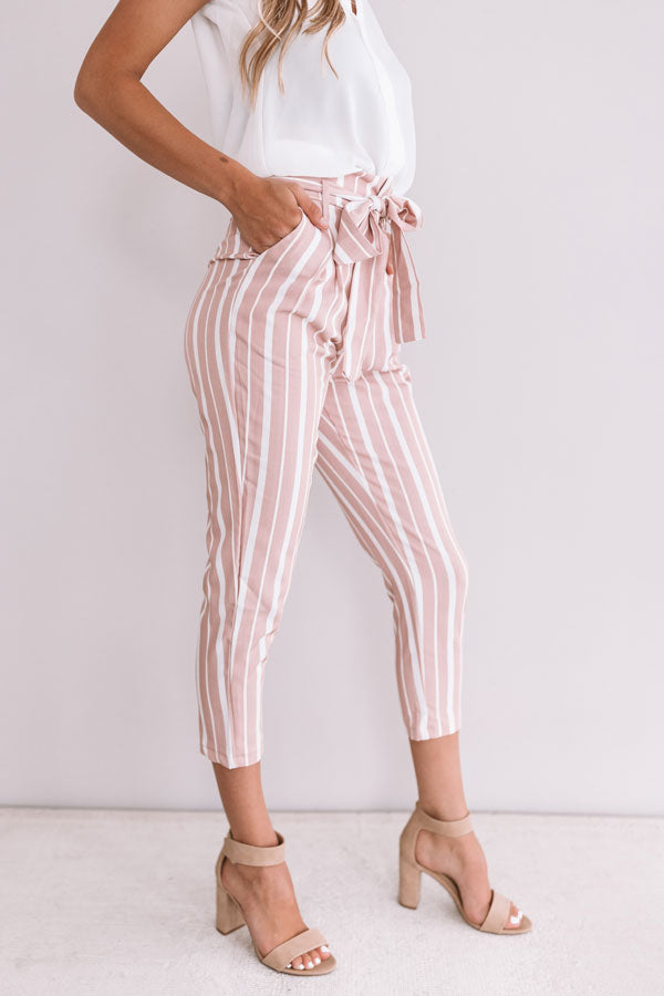 You will be the one and only girl wearing these blush striped trousers with a tie belt! They have a wide waistband, they end just above the ankle, and there is a hidden clasp in the front. Pair these with neutral heels and a clutch and you will be ready to conquer your day! Measurements