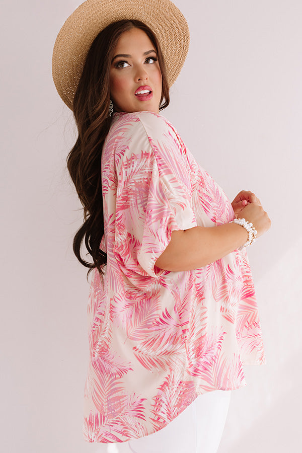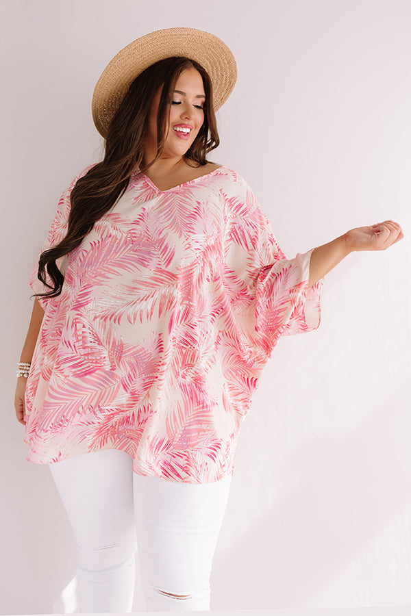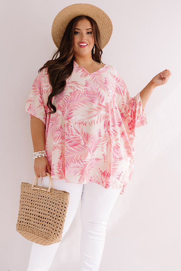 Plus Size - Look stylish on your "one way flight to Fiji" with this adorable cream hued shift tunic featuring ultra lightweight breezy material patterned with a large pink palm leaf print, a v-cut neckline, short loose batwing sleeves, and a relaxed silhouette that falls into a rounded hemline! We have styled this cutie with some distressed white skinnies, neutral wedges, and a woven hat and tote, but you can also wear it with some denim flares and "The Darcy Heel in Blush!" Measurements