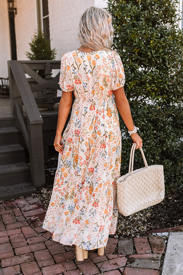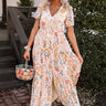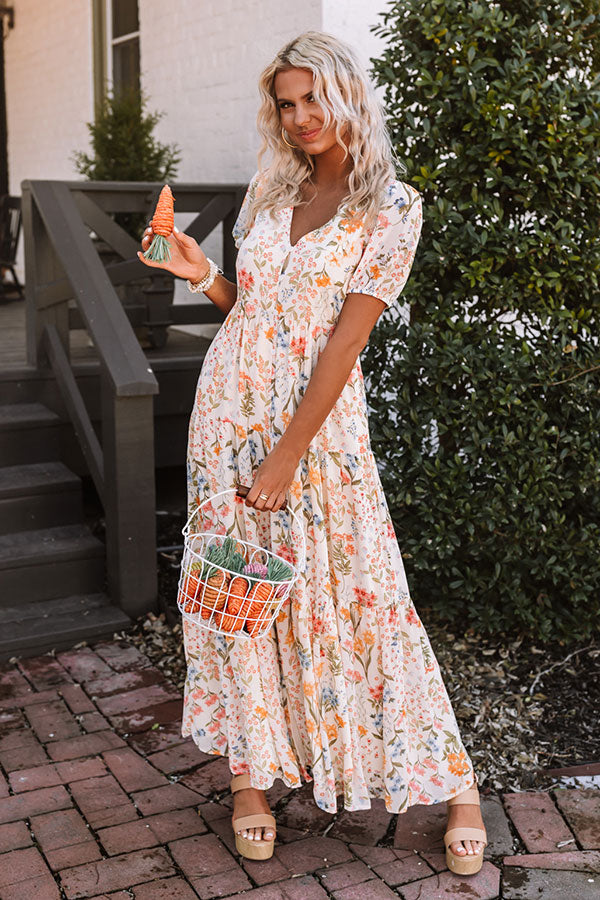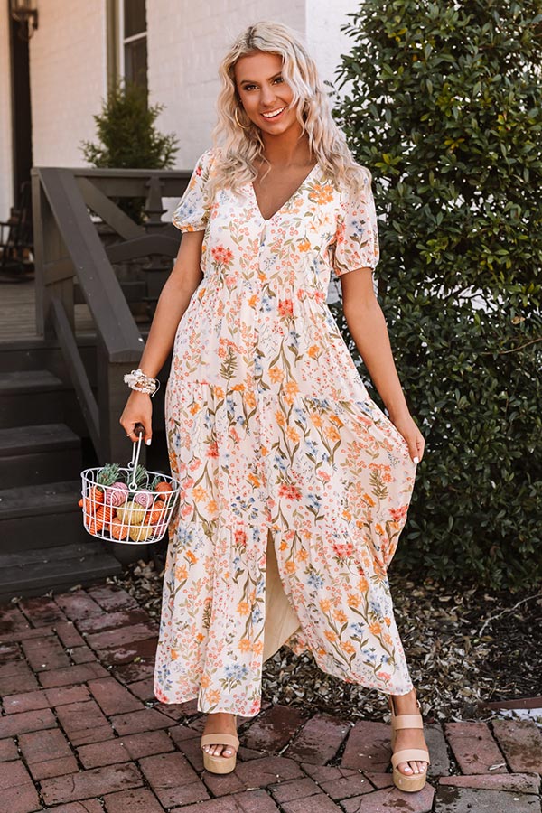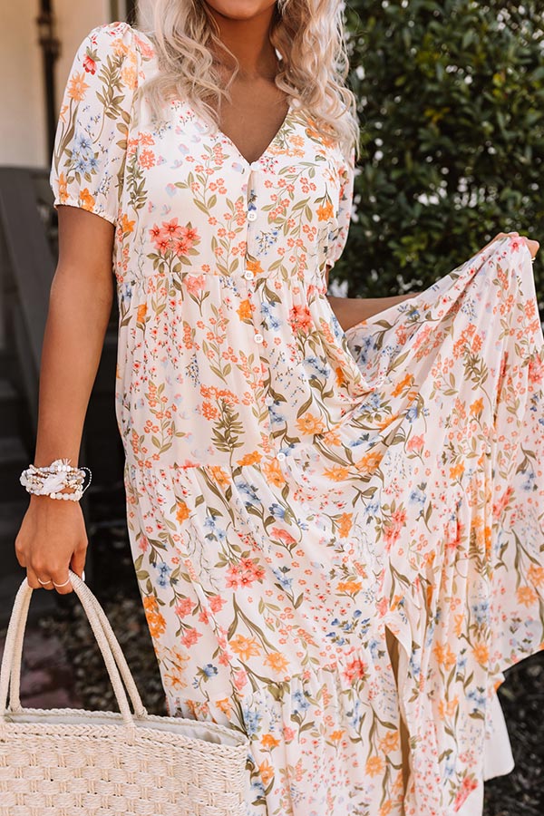 Create your own sunshine in this gorgeous cream colored maxi dress featuring lightweight material patterned with a colorful floral print, a button down front with a v-cut neckline, short sleeves, and a relaxed skirt silhouette that cascades into a straight ankle-length hemline!