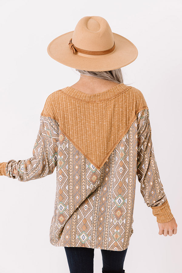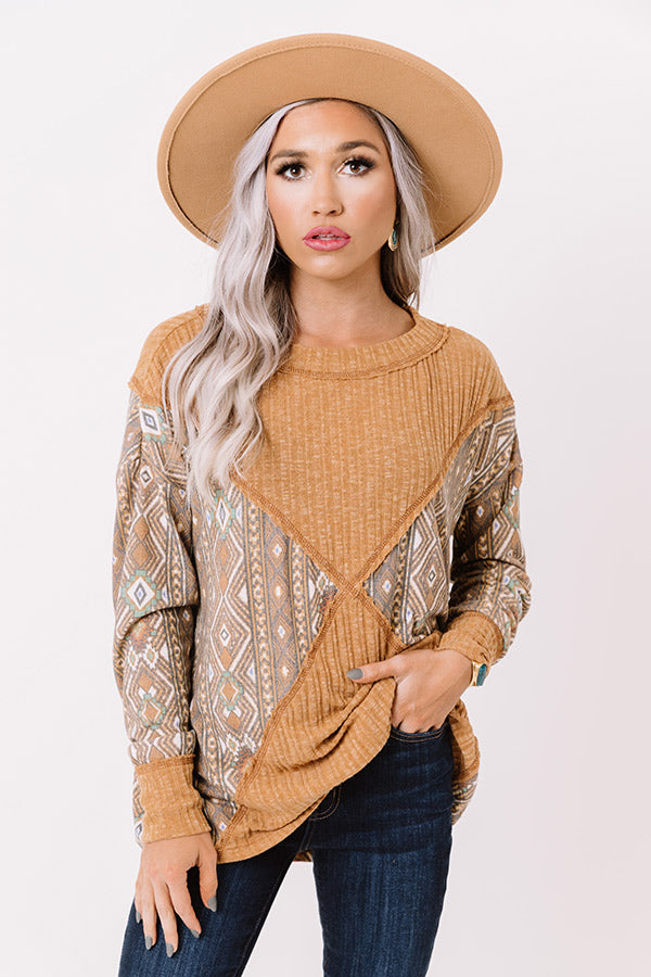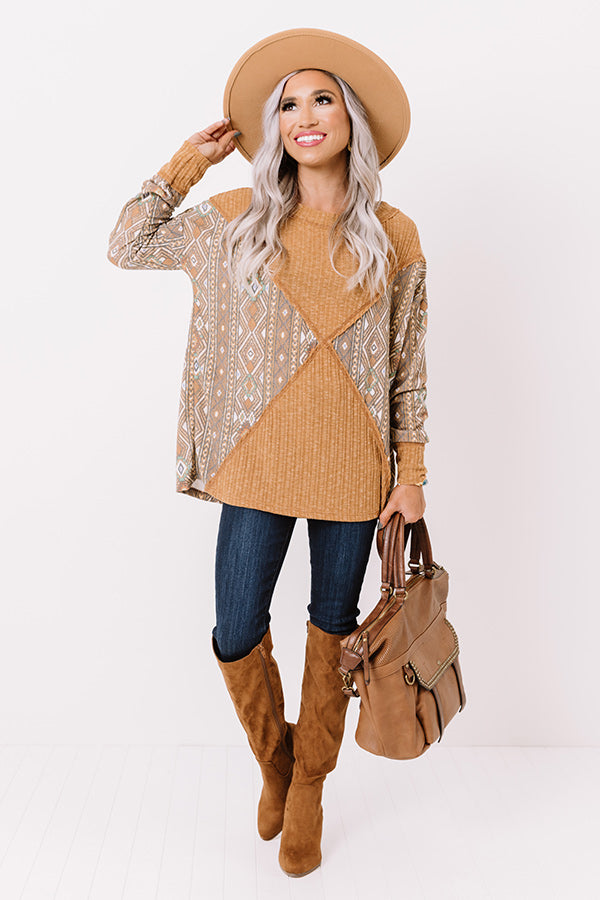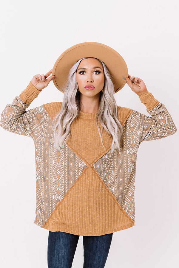 Keep your style unique with our one-of-a-kind 'Orchard Lane Shift Top' featuring lightweight material with ribbed tight knit mustard colored panels and intricate geometric print sections, long loose sleeves with forearm cuffs, a high rounded neckline, and a slouched silhouette that falls into a straight hemline with accent side slits!
