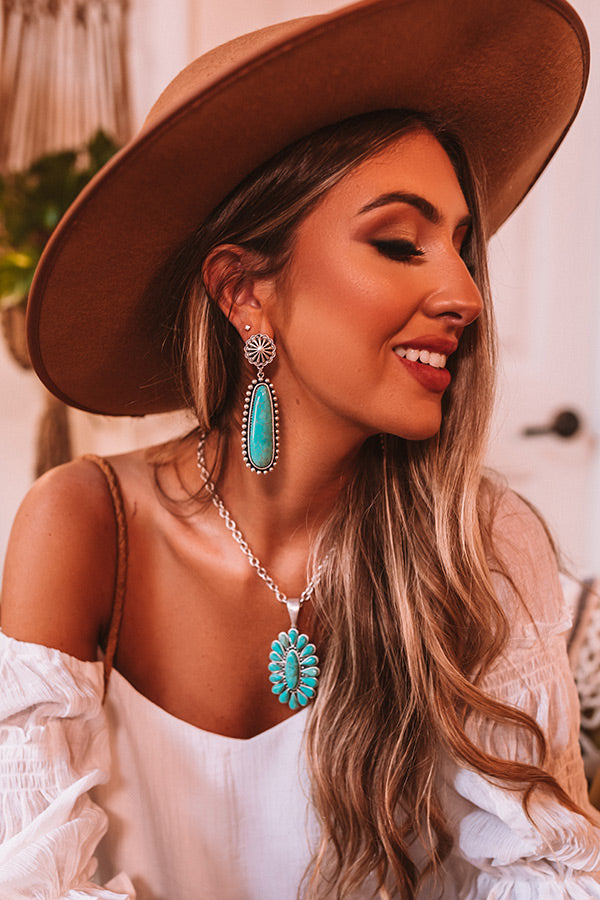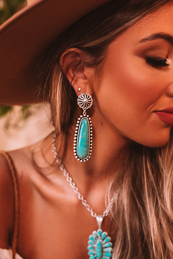 You are sure to earn extra style points when you accessorize with our adorable "Orchard Stroll" statement earrings featuring silver flower studs with dangling elongated turquoise oval pendants!