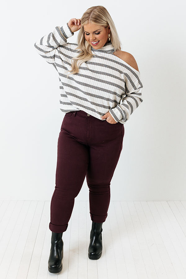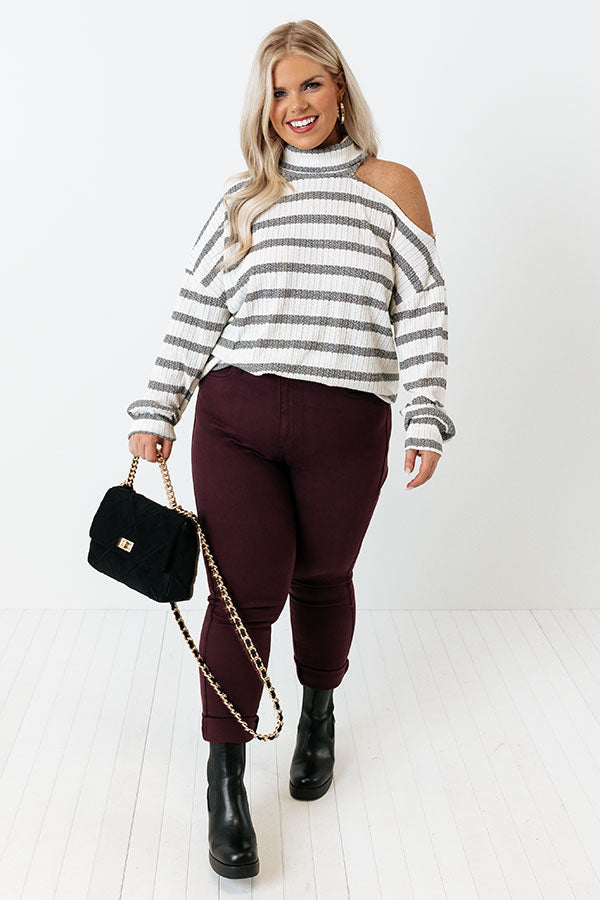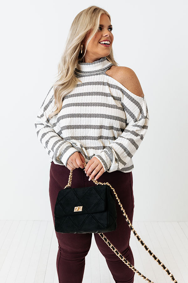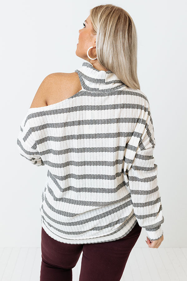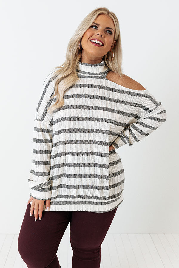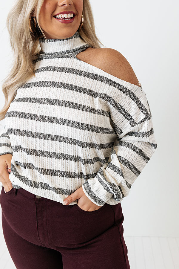 Keep your style original in this cute white plus size top featuring soft ribbed material patterned with horizontal black stripes, a rolled turtleneck, long loose sleeves with cold shoulder cutouts and fitted cuffs, and a slouched silhouette that falls into a straight hemline!