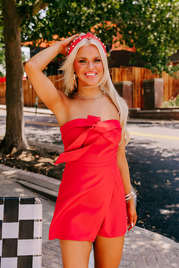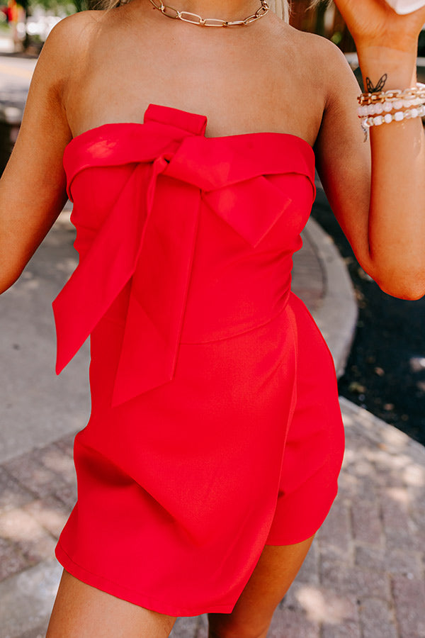 - A strapless neckline with an accent knot and an interior non-strip strip
