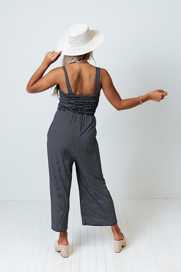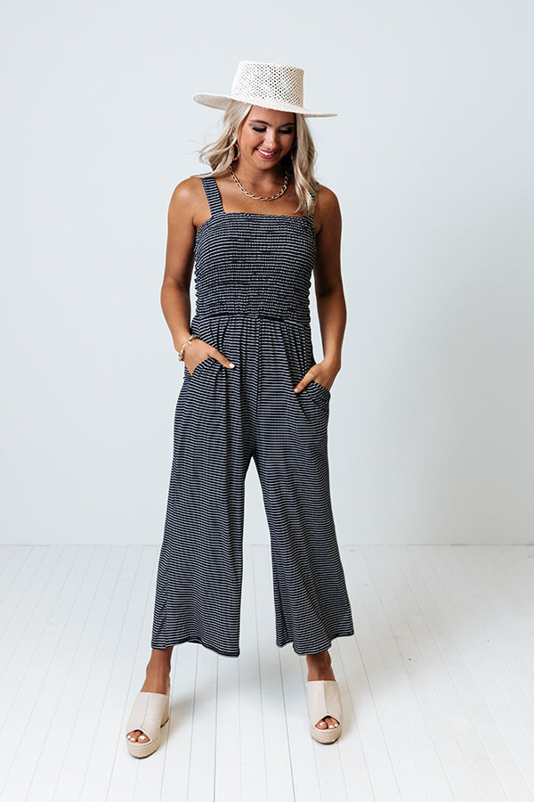Jump into style effortlessly with our adorable navy 'Out Of Line' jumpsuit featuring soft lightweight material patterned with black horizontal pin stripes, a square neckline and upper back with 1-inch shoulder straps, a flattering smocked bodice, accent side pockets, and a relaxed pants silhouette that falls into straight mid-calf length hemlines!