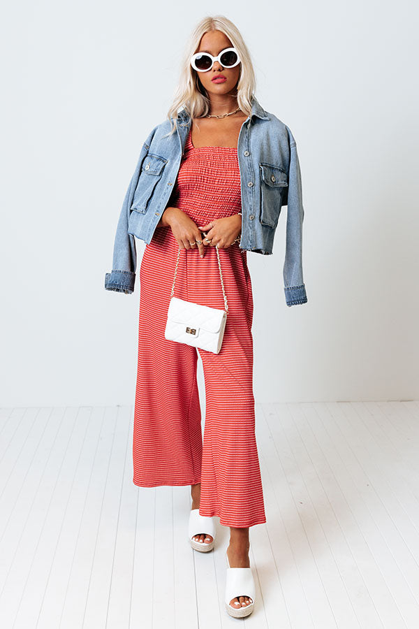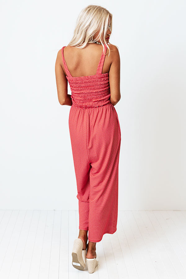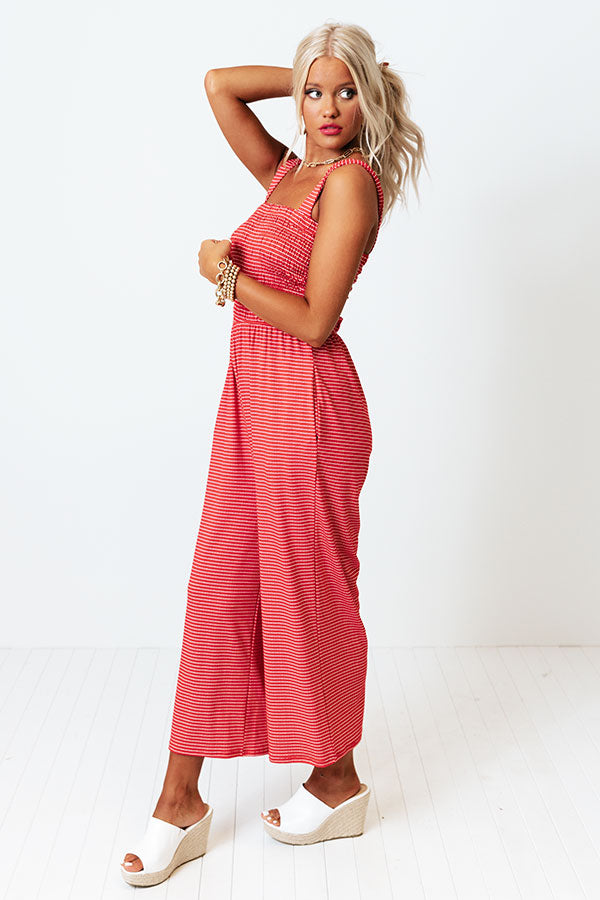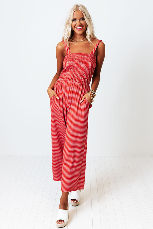 Jump into style effortlessly with our adorable red 'Out Of Line' jumpsuit featuring soft lightweight material patterned with black horizontal pin stripes, a square neckline and upper back with 1-inch shoulder straps, a flattering smocked bodice, accent side pockets, and a relaxed pants silhouette that falls into straight mid-calf length hemlines!