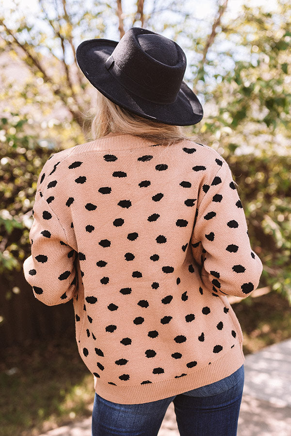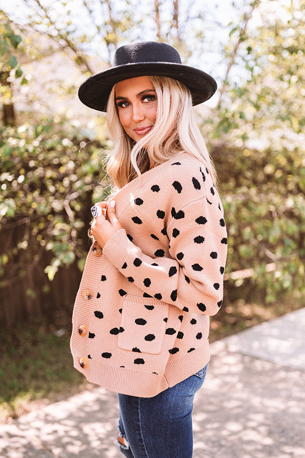 We have no doubt you'll want to wear this khaki colored cardigan on repeat with its ultra soft lightweight tight knit material, large black polka dot pattern, a button down front with a v-cut neckline, long loose sleeves with fitted cuffs, accent side pockets, and a relaxed silhouette that falls into a straight hemline! You can layer this versatile piece with just about anything from a basic tank to a sweater, jeans to dresses, wedges to sandals, clutches to totes, and hats to earrings for a variety of cold weather ready looks! Measurements