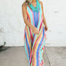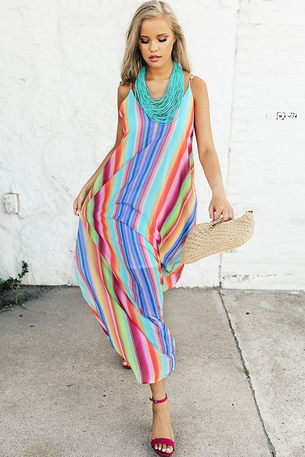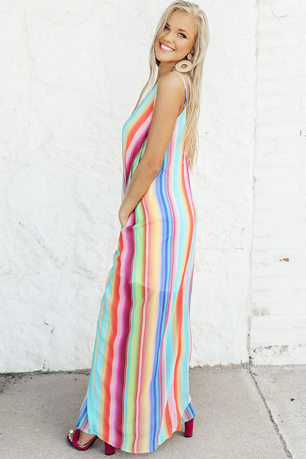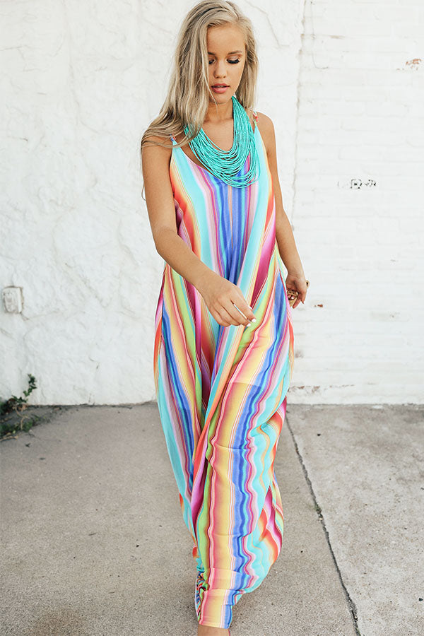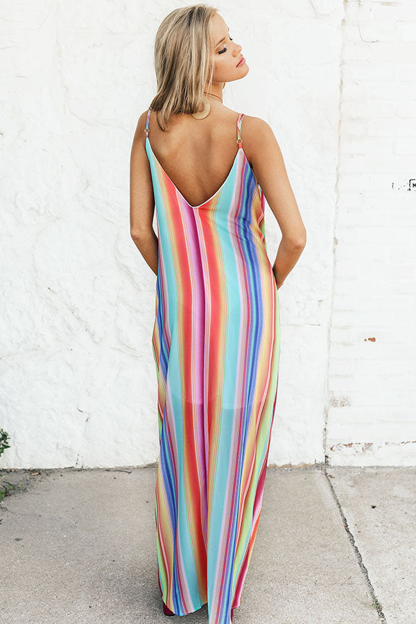Somewhere over the rainbow - The skies are blue, and the dreams you dare to dream come true... Like the "Over The Rainbow Maxi!" This colorful striped maxi dress has a v-cut neckline, thin adjustable straps, an ultra relaxed polyester silhouette with hidden side pockets & a v-cut back. Style with a few colorful statement accessories & a sassy heel, for a dreamy look that is full of personality!