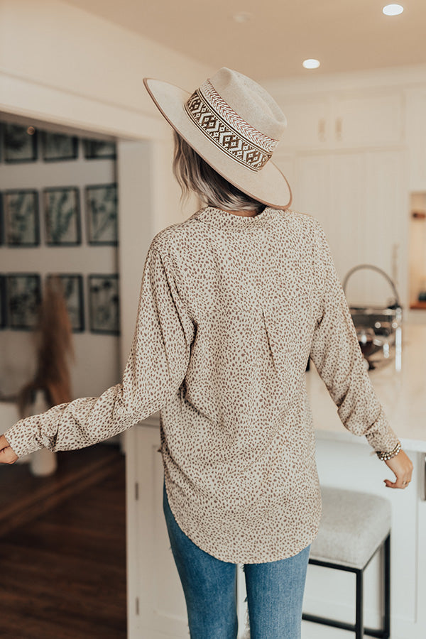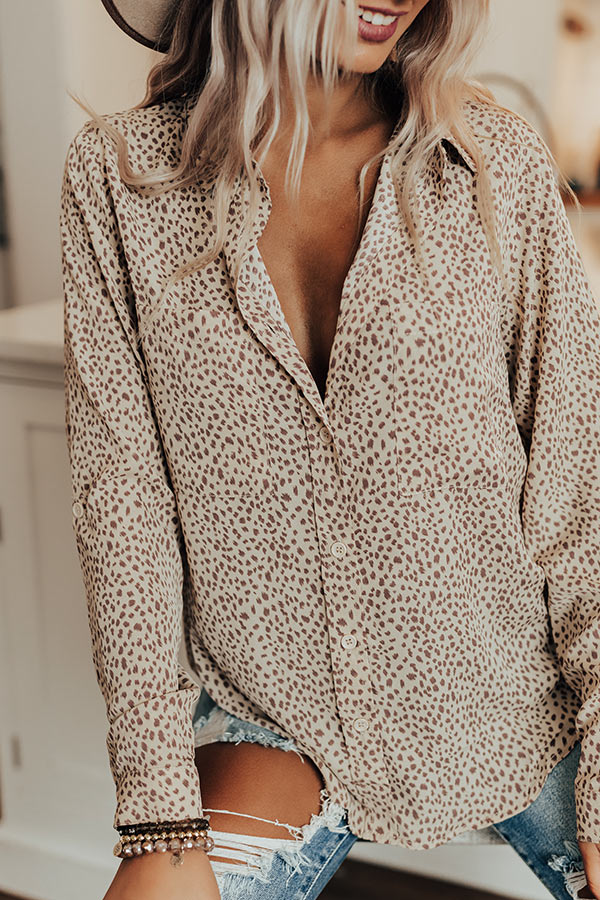 Get dressed on the wild side in our adorable 'Overlook Hotel' top featuring lightweight material patterned with a small brown leopard print, a button up front with a collared neckline, long loose sleeves with button closure cuffs, and a relaxed silhouette that falls into a rounded hemline! Measurements