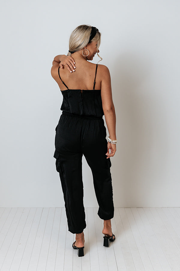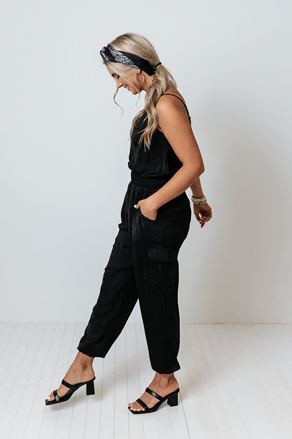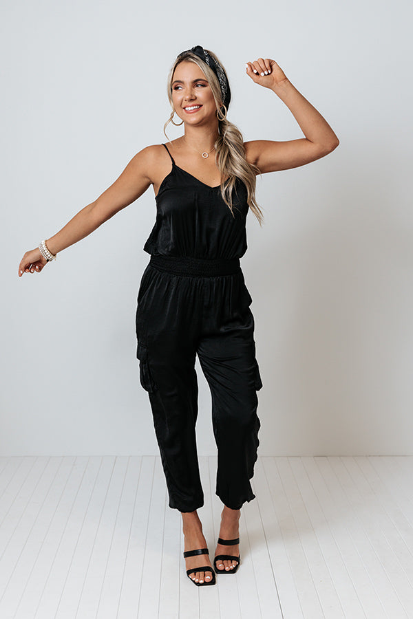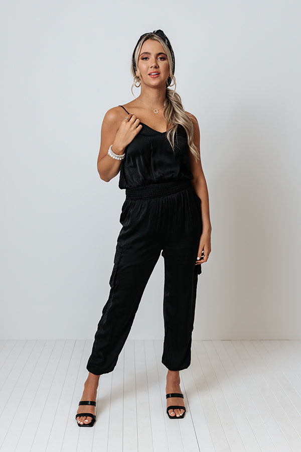 army green hued 'Overlooking Venice Jumpsuit' featuring lightweight silk-like material, a wide v-cut neckline with adjustable spaghetti straps, a keyhole accented upper back with a button closure, a wide smocked waistline, accent cargo pockets, and a relaxed pants silhouette that tapers into fitted ankle-length hemlines! Measurements
