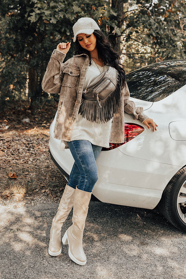 You will own the season with this corduroy buttoned down jacket in warm taupe! Features a collared neckline, long loose sleeves with button closure cuffs, two hidden and chest pockets with accent button flap closures, and a flattering silhouette that falls into a round hemline with accent slits.