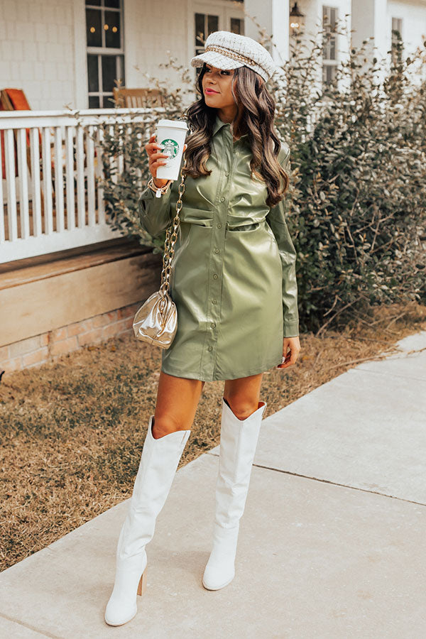Make an entrance in our gorgeous 'Own The World' dress in sage! It features a glossy lightweight faux leather material, a buttoned down collared neckline, long sleeves with a single button cuff closure, two side pockets, subtle pleated waistline, and figure flattering silhouette that falls into a straight mid-thigh hemline.