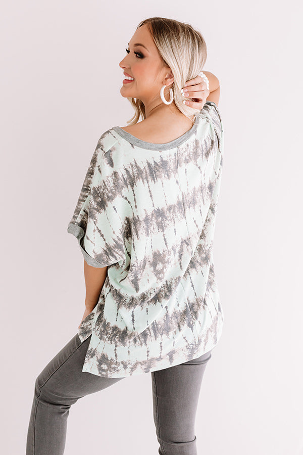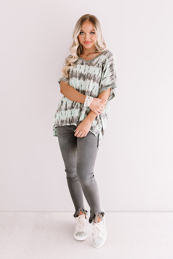 Lounge in style with our comfy "Oxford Dreams Shift Tee" featuring soft lightweight material patterned with mint and grey hued tie dye, grey trim detailing, a v-cut neckline that can be worn off one shoulder, short loose sleeves, and an ultra relaxed silhouette that falls into a straight hemline with accent side slits! We have styled this cutie with some charcoal skinnies and trendy sneakers, but you can also wear it with some distressed denim shorts, sunnies, and "The Melina Heel in Mint!" Measurements