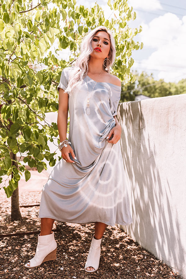 Arrive in style with our trendy grey "Pacific Coast Highway" maxi dress featuring soft lightweight breezy material patterned with white circle tie dye, a v-cut neckline that can be worn off one shoulder, short loose sleeves with rolled cuffs, and an ultra relaxed silhouette that falls into a straight floor-length hemline! We have paired this casual cutie with a white wedged bootie and woven clutch, but you can also wear it layered under a jean jacket with "The Saylie Peep Toe Heel in Blush" and our "Corner Cafe Wool Hat in Blush!"