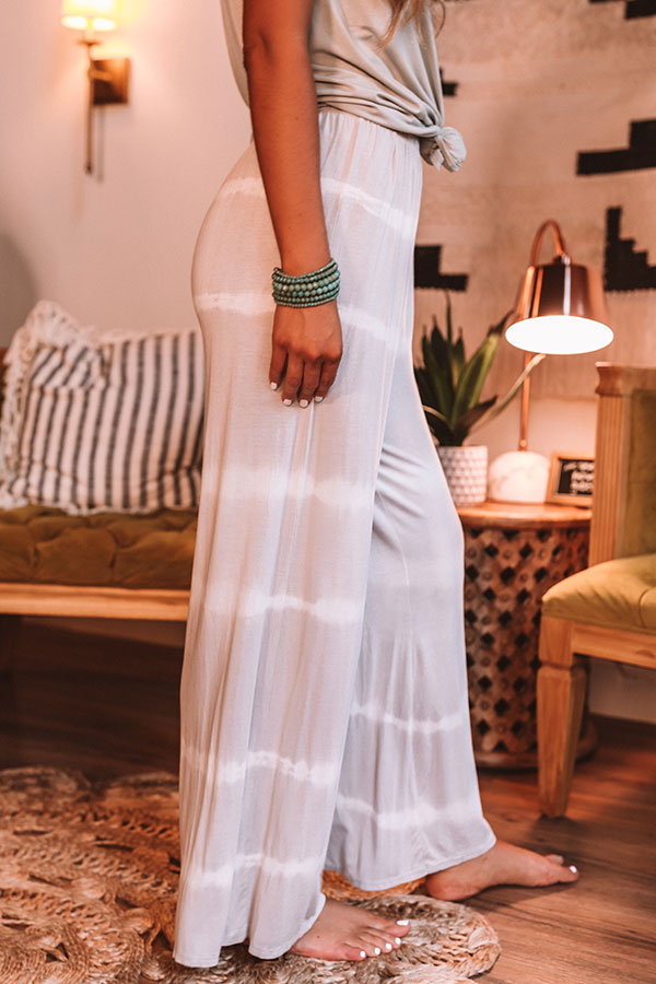 Coast from season to season in style with these stylish grey pants featuring soft lightweight material patterned with white horizontal tie dye accent stripes, a wide elastic waistline, and an ultra relaxed silhouette that falls into straight floor-length hemlines! These comfy cuties pair perfectly with a basic tee, but you can also wear them with a white bodysuit under a jean jacket, our white "Flake Slip On Sneaker," sunnies, and "The Essential Faux Leather Backpack in Grey!"