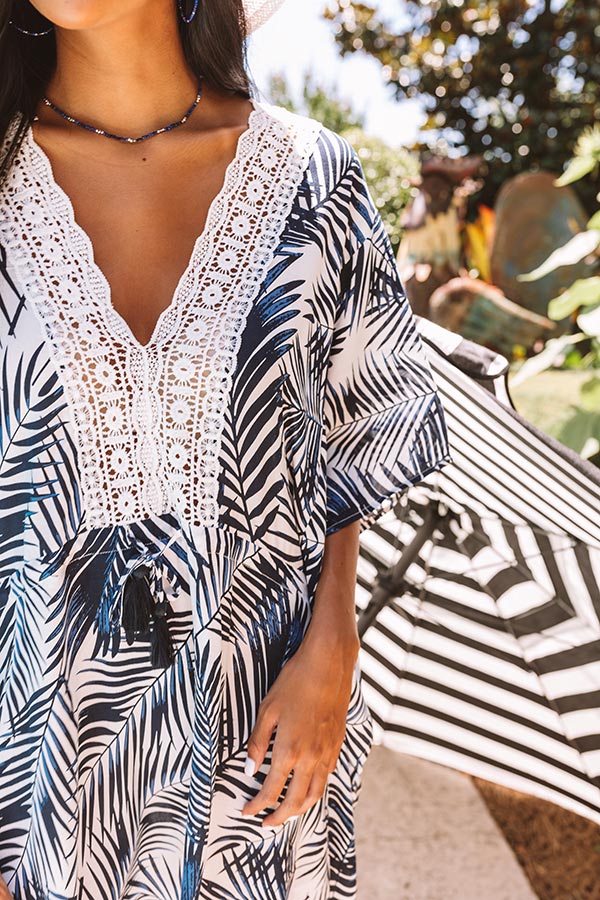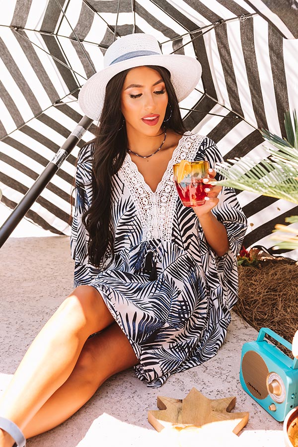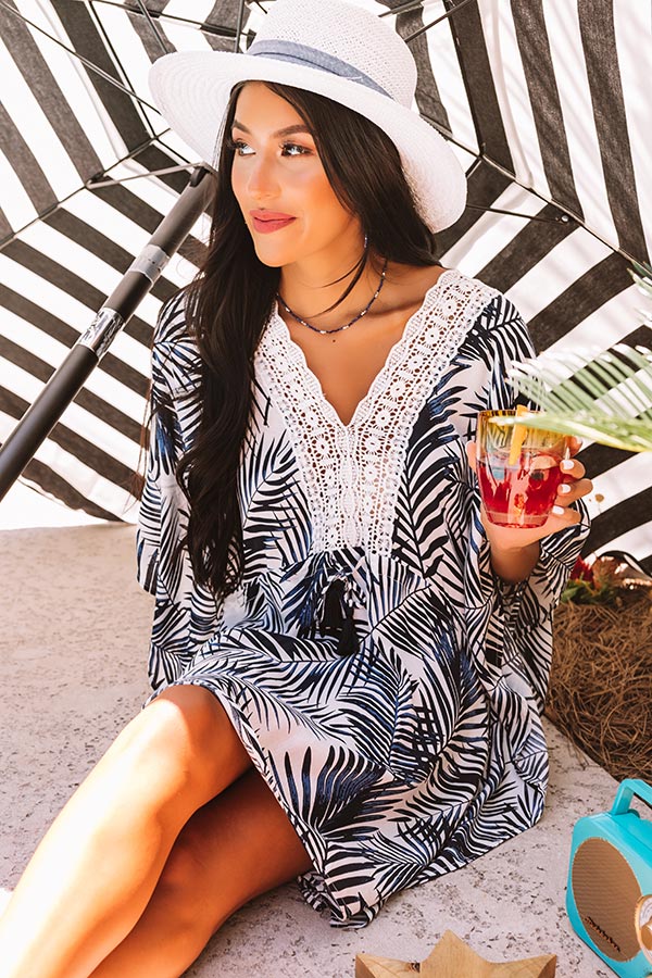 Achieve effortless style this summer with our adorable "Pacific Coast Palms" dress featuring lightweight material patterned with a navy palm leaf print, a deep v-cut neckline and open back with a tie closure, wide crochet trim detailing, oversized 3/4-length bat wing sleeves, and an ultra relaxed silhouette that falls into an uneven mid-thigh length hemline! This amazing piece styles perfectly with a matching woven hat, but you can also wear it with our "Vacation Friendly Wedge in Navy" and our "Costa Kisses Woven Tote!"