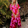 - Lightweight, satin material with a red and hot pink abstract floral design