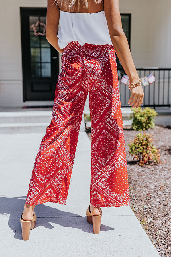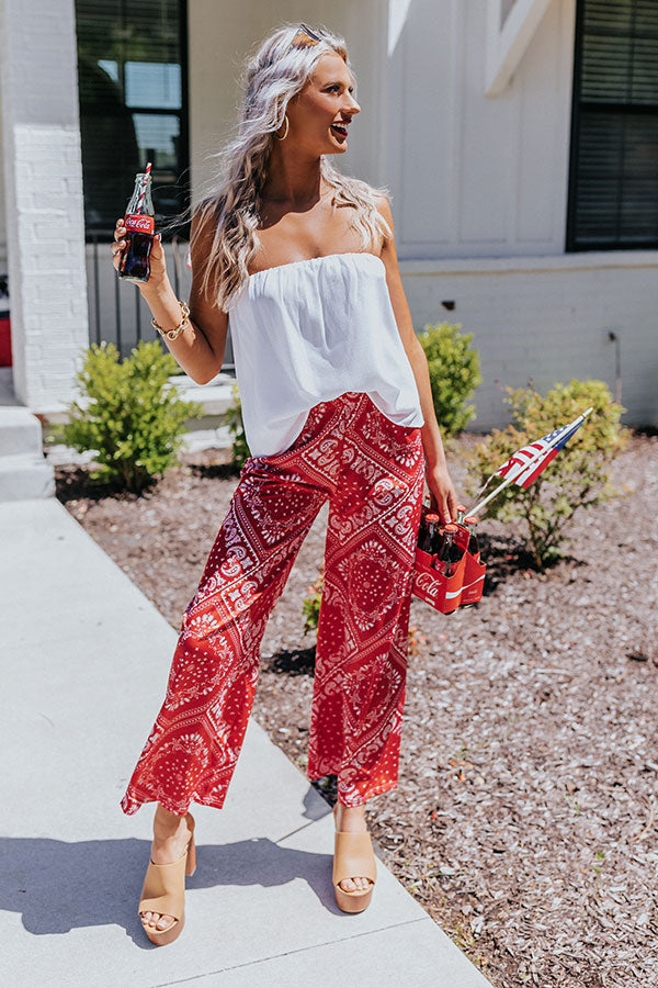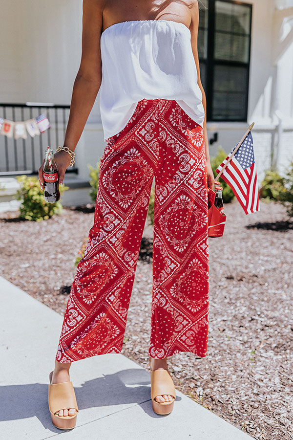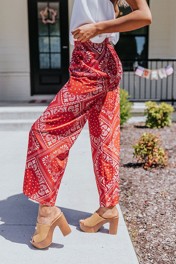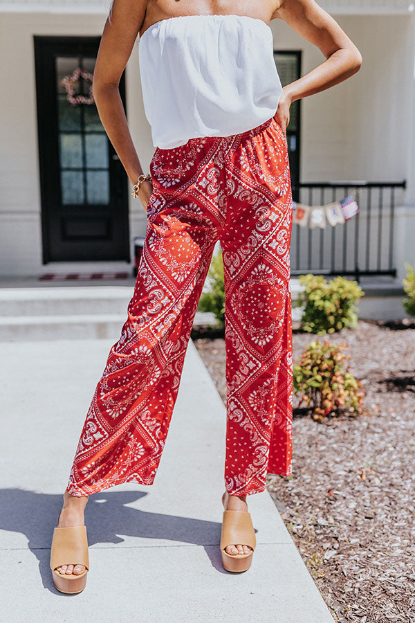 You will look like perfection in these charming red pants featuring lightweight breezy material patterned with a cute white paisley print, an elastic waistline, and a relaxed but flattering silhouette that falls straight into ankle-length hemlines! Measurements