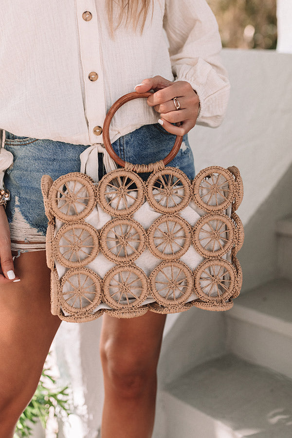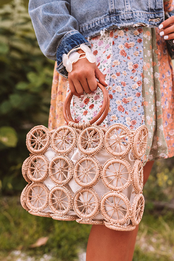 You are sure to feel nothing but bliss when you accessorize with this unique tote featuring a rectangular woven pinwheel silhouette with two faux wood hoop handles and an additional cinch closure pouch!