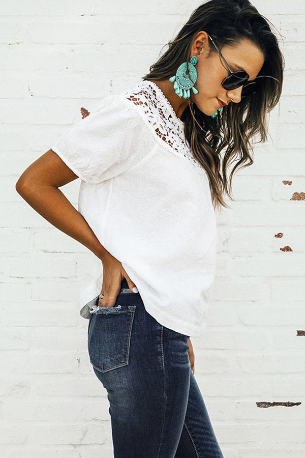 Nothing says "boho chic" quite like the "Palm Beach Shift Top!" This sweet shift top has a gorgeous crochet embroidered neckline & upper back, short capped sleeves & a breezy textured cotton bodice. Style with your favorite denim for a posh put-together look that you will find yourself wearing time & time again!