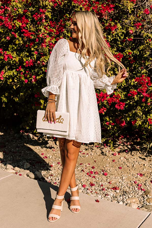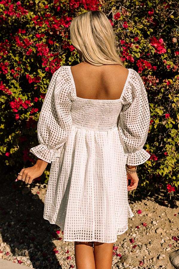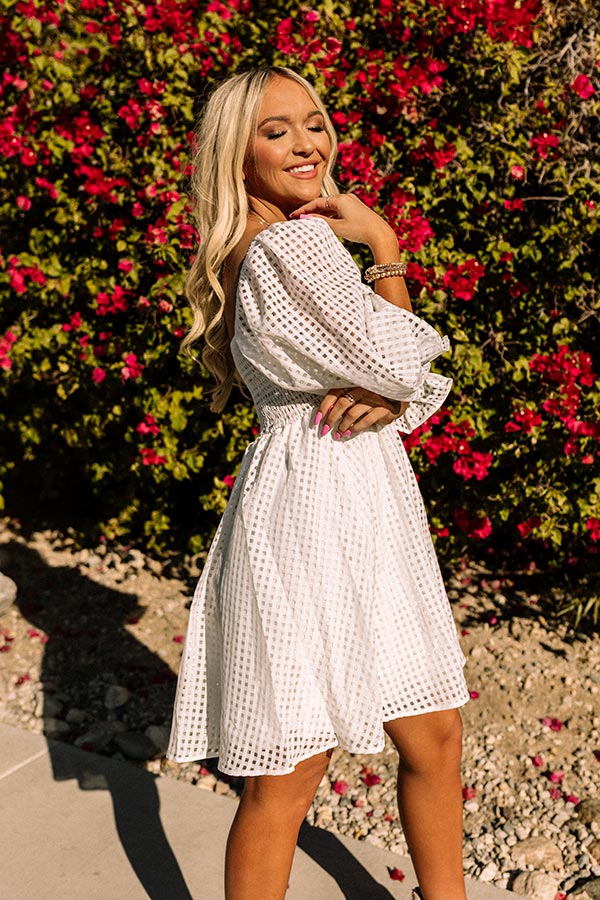 You can be confident that you will turn heads in our pretty little white 'Palm Canyon Drive Dress' featuring lightweight material with square mesh texturing, a straight neckline and upper back, puff half sleeves with subtly flared cuffs, and a flirty skirt silhouette that falls straight into a straight mid-thigh length hemline!