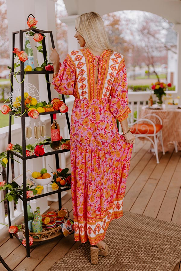 You will look absolutely perfect in this stunning maxi dress featuring lightweight breezy material patterned with a beautiful pink and orange abstract and floral print, a v-cut neckline and upper back with a tie closure, loose 3/4-length sleeves, a cinched waistline with a tie detail, and a relaxed skirt silhouette that cascades into a straight ankle-length hemline! on products