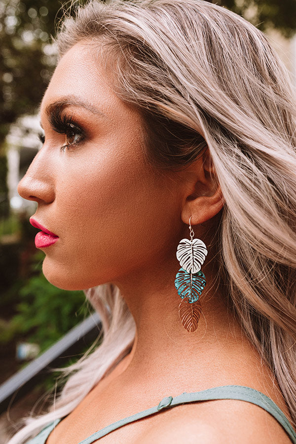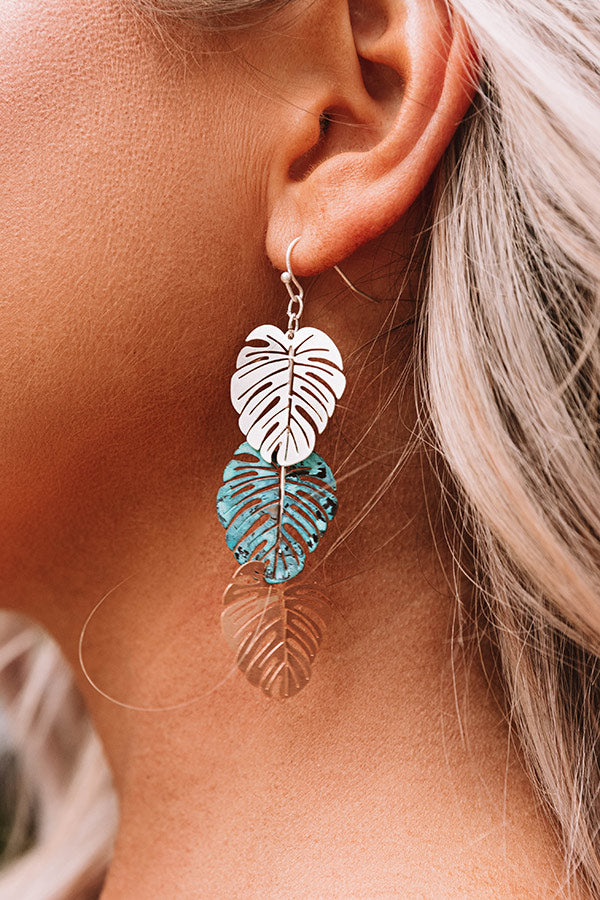 Get vacay ready by accessorizing with our lightweight "Palm Tree Pretty" statement earrings featuring dangling silver, dark turquoise, and gold metal palm tree leaves!