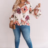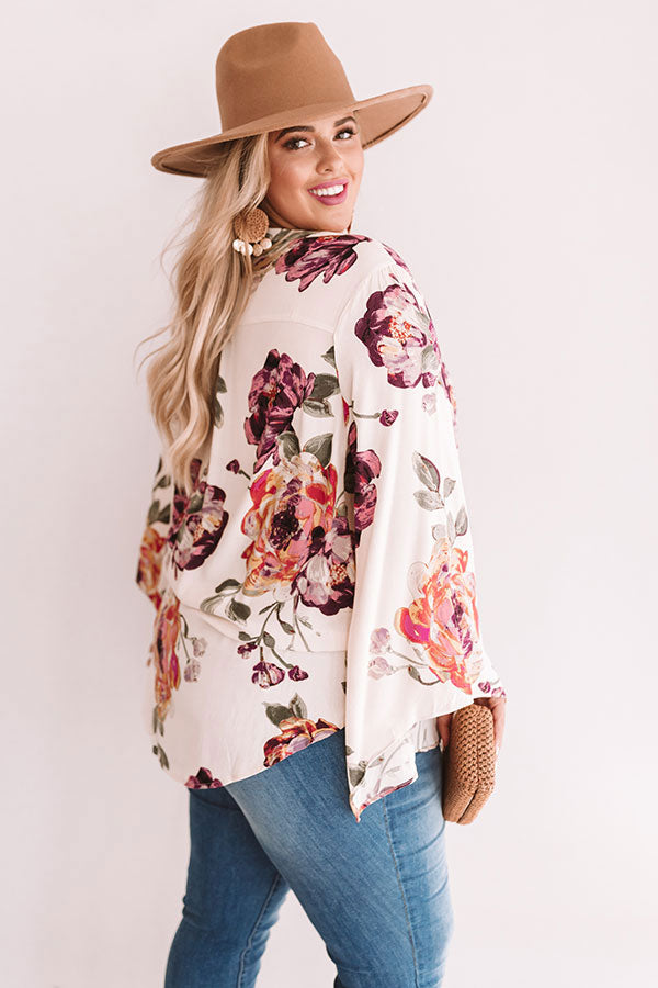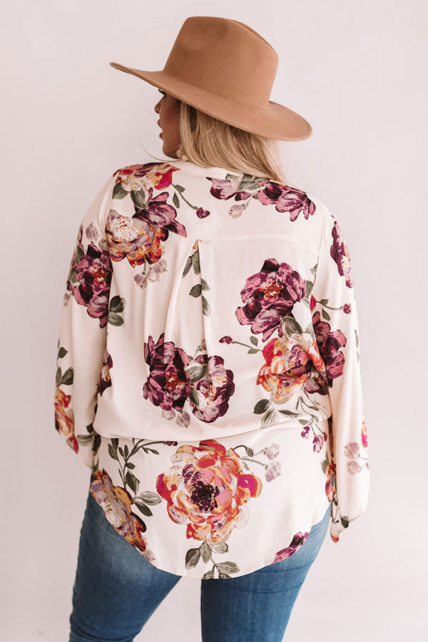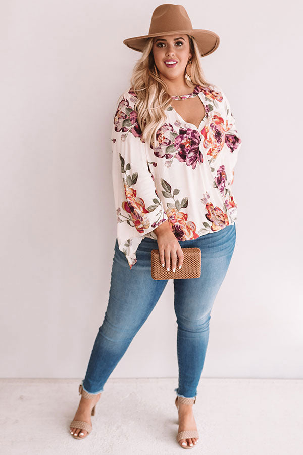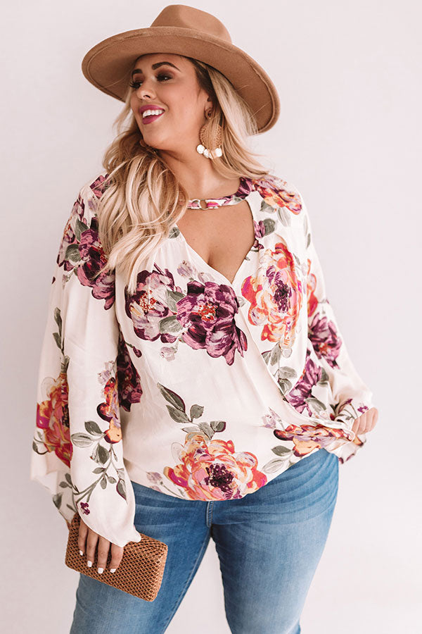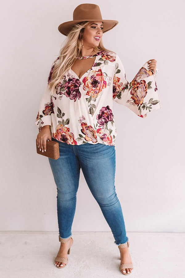 Plus Size - This pretty floral top features a v-neck cutout below a neck strap with a snap closure, an uneven hem with the front being tucked, and loose flared sleeves! Style with some distressed jeans, a nude heel, and matching accessories or with our "Baker High Waist Shorts in Vineyard Grape" and "The Janie Heel" for an outfit that will have you looking beautiful while hanging under the palms and getting kisses from the sun! Measurements