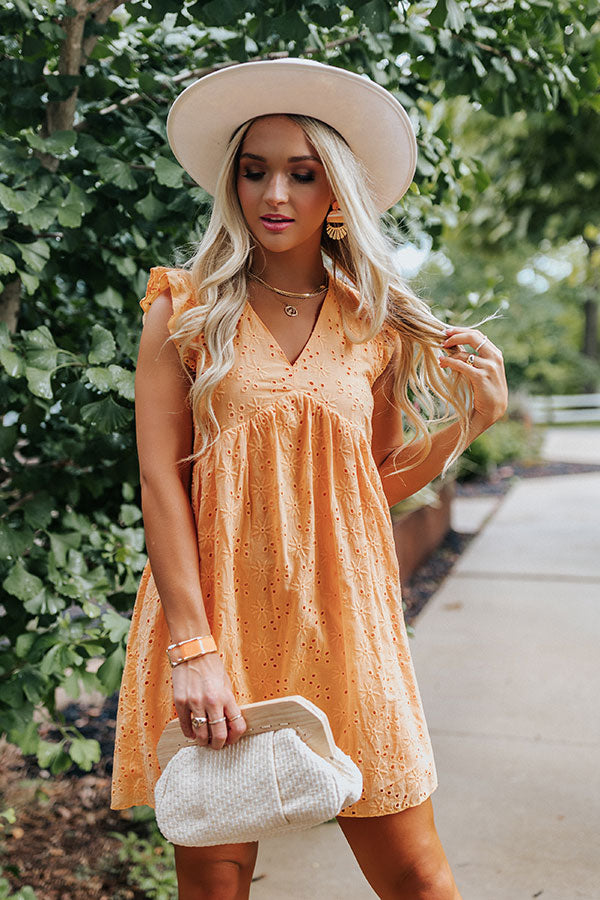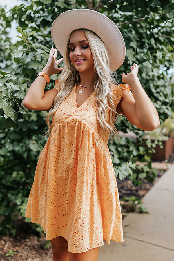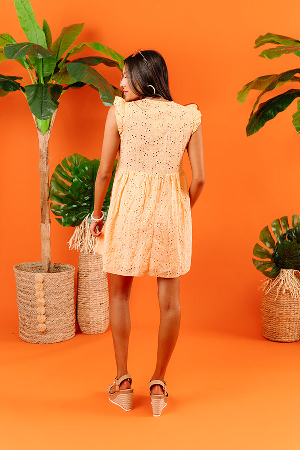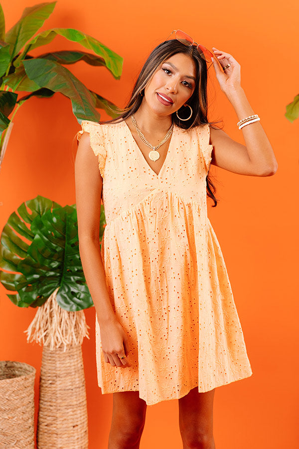 Create your own sunshine in our darling light orange 'Panama City Sipping' dress featuring lightweight breeze material with intricate eyelet detailing, a v-cut neckline, ruffled cap sleeves, and a relaxed babydoll silhouette that falls into a straight mid-thigh length hemline! Measurements